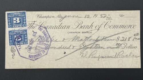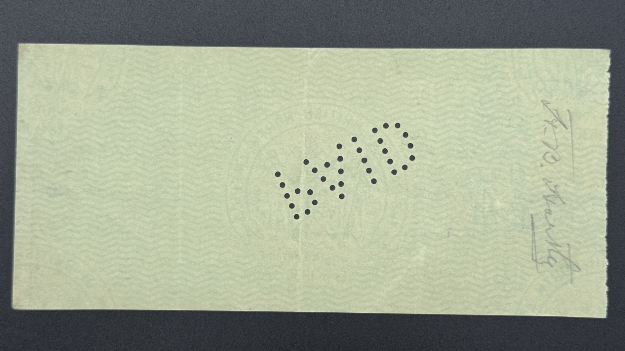 Ce chèque bancaire, émis par The Bank of British North America et ayant réellement circulé, incarne une esthétique post-victorienne où la monnaie scripturale devient œuvre graphique. Son papier patiné, ses perforations mécaniques, ses encres manuscrites et ses cachets d’encaissement racontent une histoire de gestes financiers réels, de confiance institutionnelle, et de rigueur comptable. Mais c’est le timbre-poste canadien collé directement sur le chèque, pratique courante à l’époque, qui en fait une pièce unique : à une époque où les enveloppes étaient souvent omises, le timbre devenait sceau d’authenticité, preuve d’acheminement ou de validation. L’écriture cursive, parfois néo-gothique, les encadrés typographiques, les filigranes discrets et les tampons circulaires forment une chorégraphie visuelle où chaque élément participe à la mise en scène d’un document vivant. Proposé dans une approche muséale, ce chèque utilisé se distingue par sa valeur patrimoniale, sa beauté silencieuse, et sa capacité à transmettre le souffle d’une époque révolue, où l’économie passait par le papier, la plume et le sceau.