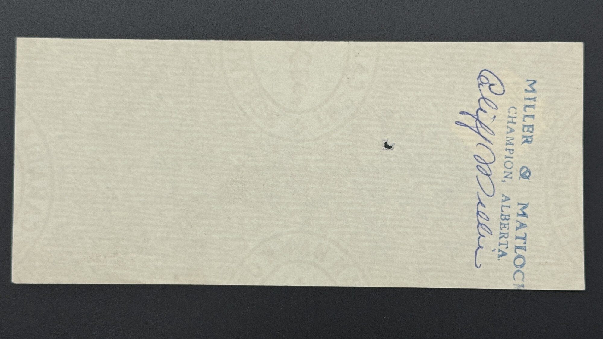 Ce chèque utilisé, émis par The Canadian Bank of Commerce à Champion, Alberta, est une pièce scripturale vivante, témoin d’une époque où la correspondance bancaire se passait souvent sans enveloppe, et où les timbres fiscaux, ici un Canada de 3 cents, étaient collés directement sur le chèque, devenant à la fois sceau d’authenticité et trace d’acheminement. Le document est enrichi d’un cachet octogonal violet, daté et estampillé, qui marque son passage en caisse avec une rigueur presque cérémonielle. L’écriture manuscrite, fluide et légèrement néo-gothique, danse entre les encadrés typographiques, tandis que la ligne d’annulation traverse le chèque comme une cicatrice administrative, preuve de son usage réel. Chaque élément ; le papier, l’encre, le timbre ou le sceau compose une chorégraphie visuelle et historique, où la monnaie scripturale devient objet patrimonial, porteur de gestes, de confiance et de mémoire. Proposé dans une approche muséale, ce chèque circulé incarne la beauté silencieuse des documents ayant traversé le temps, et révèle l’élégance discrète des pratiques bancaires du Canada rural des années 1950.