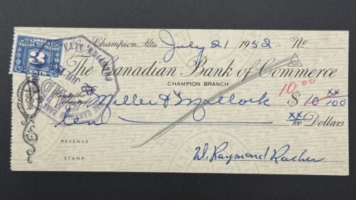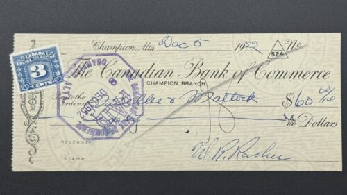 Présenté ici dans sa forme vierge et recto-verso, ce chèque bancaire vintage émis par La Banque Canadienne de Commerce à St. Bruno, Province de Québec, incarne la sobriété typographique et la rigueur scripturale des pratiques financières du milieu du XXe siècle. Imprimé en bilingue français-anglais, il arbore une mise en page équilibrée : triangle numéroté, lignes de saisie pour le bénéficiaire, la date et la signature, et mentions officielles de la succursale de Chambly. Le verso, vierge, laisse deviner les usages postaux ou comptables qui auraient pu s’y inscrire. Conservé en état immaculé, sans perforation ni annotation, ce chèque se distingue par sa valeur documentaire, son intérêt typographique, et son ancrage régional dans l’histoire bancaire québécoise. Proposé dans une approche para-numismatique, il illustre la matérialité de la monnaie scripturale, et la beauté silencieuse des documents qui ont structuré les échanges, les promesses et les transactions d’une époque révolue.