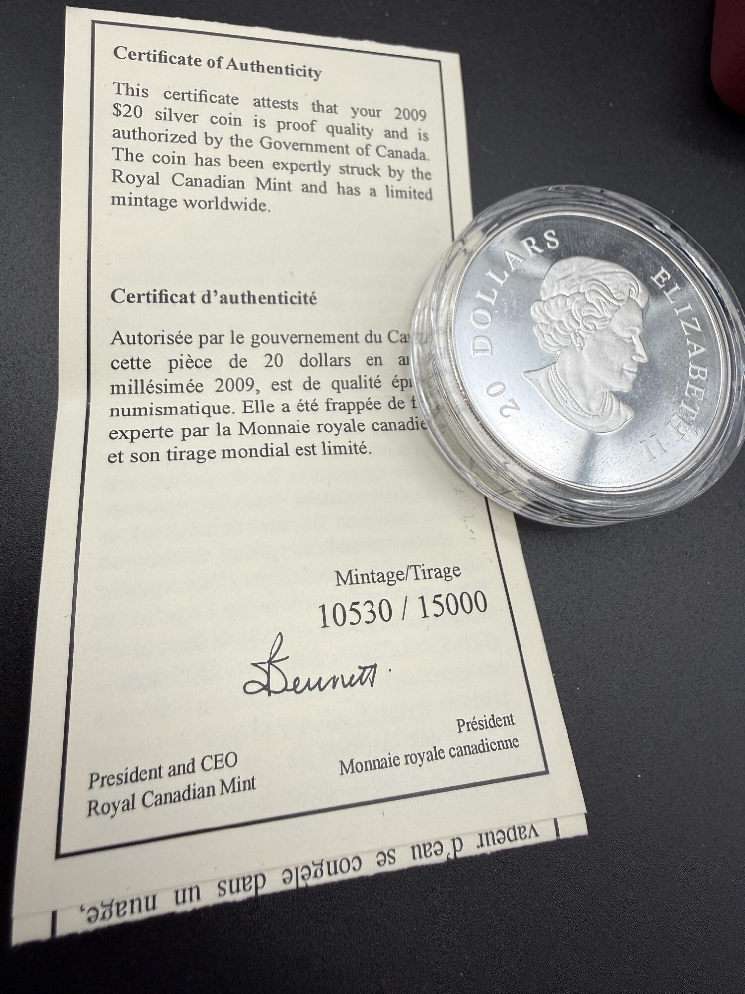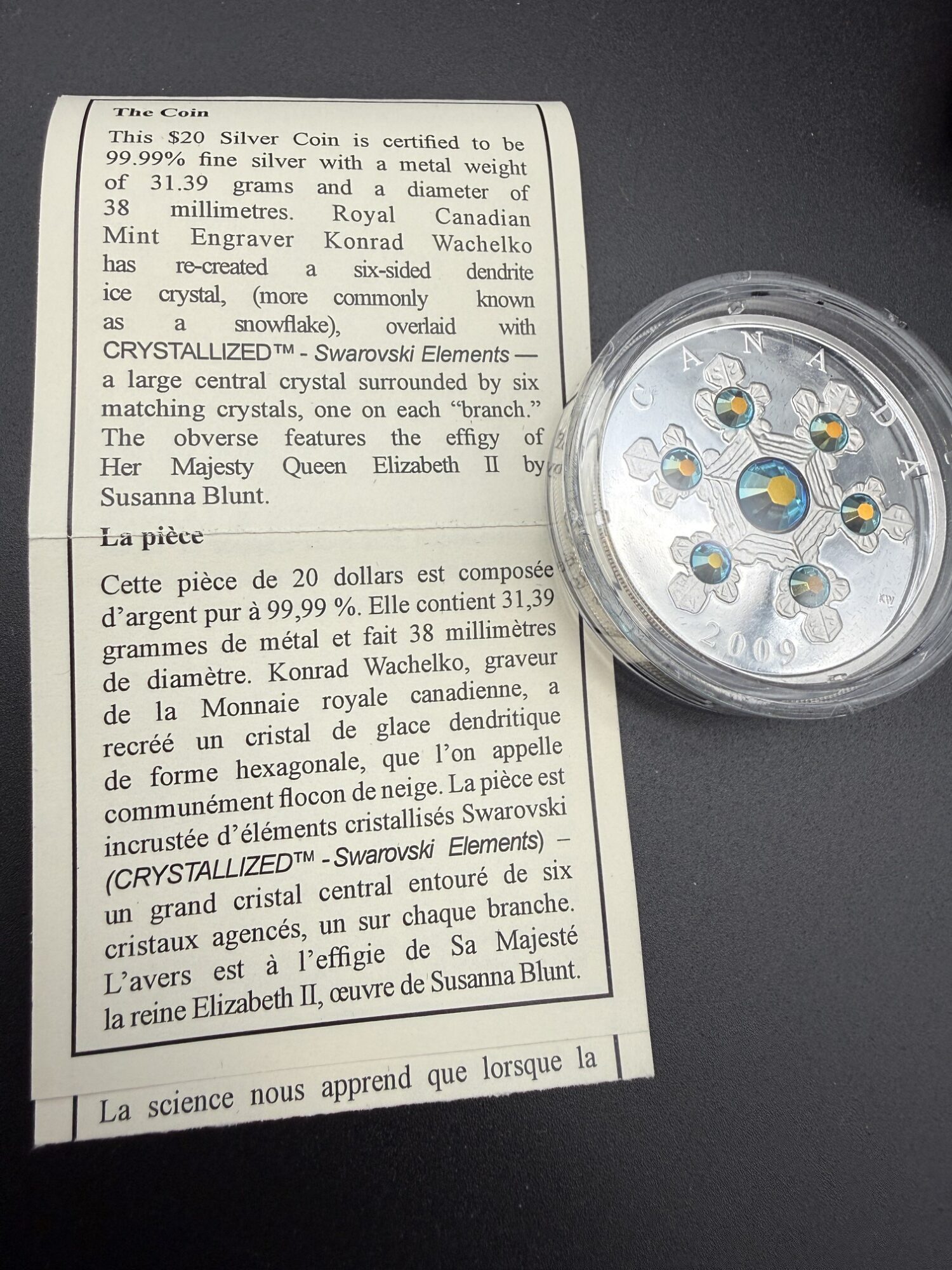 Frappée en 2009 par la Monnaie Royale Canadienne, cette pièce de 20 dollars en argent pur possède une teneur exacte de 1 oz. troy d’argent fin et présente un flocon de neige stylisé serti de six cristaux Swarovski aux reflets bleutés. Le revers, finement gravé, évoque la géométrie hivernale dans une composition symétrique et lumineuse. Tirée à 15 000 exemplaires, cette frappe conjugue élégance décorative, éclat cristallin et sensibilité patrimoniale. Présentée dans son coffret de collection et accompagnée de son certificat d’authenticité, elle s’impose comme une pièce scintillante où l’argent pur reflète la poésie du givre.
