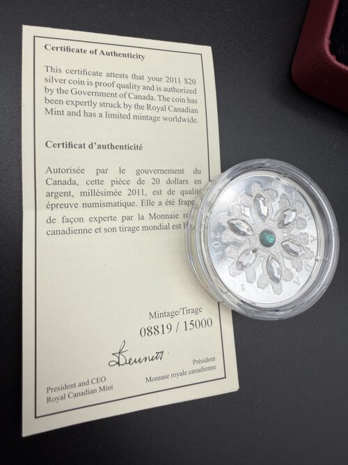 Émise en 2012 par la Monnaie royale canadienne, cette pièce de 1 cent en argent pur à 99,99 % marque la fin d’une ère monétaire, celle du retrait officiel de la pièce d’un cent du système canadien. Le revers reprend le célèbre motif à deux feuilles d’érable, rehaussé d’un placage sélectif en or rose, comme un dernier éclat pour cette icône familière. L’avers présente l’effigie de Sa Majesté la reine Elizabeth II selon Susanna Blunt. D’un diamètre de 34 mm et d’un poids nominal de 15,87 g, cette frappe en épreuve numismatique est limitée à 30 000 exemplaires. Présentée dans son coffret rouge de conservation avec certificat d’authenticité bilingue, elle incarne une mémoire gravée, un adieu poétique à la plus modeste des pièces, désormais élevée au rang de relique nationale.
