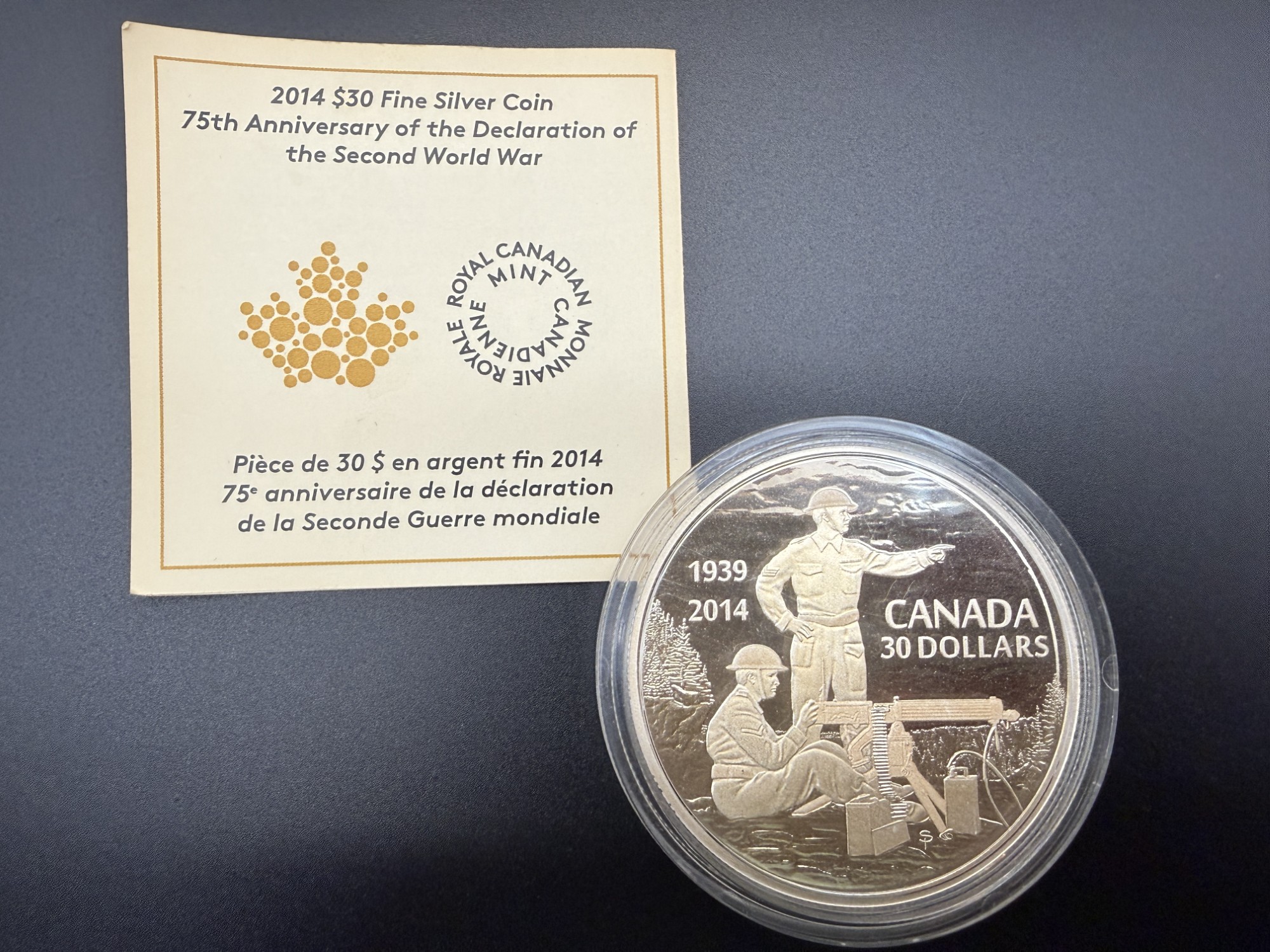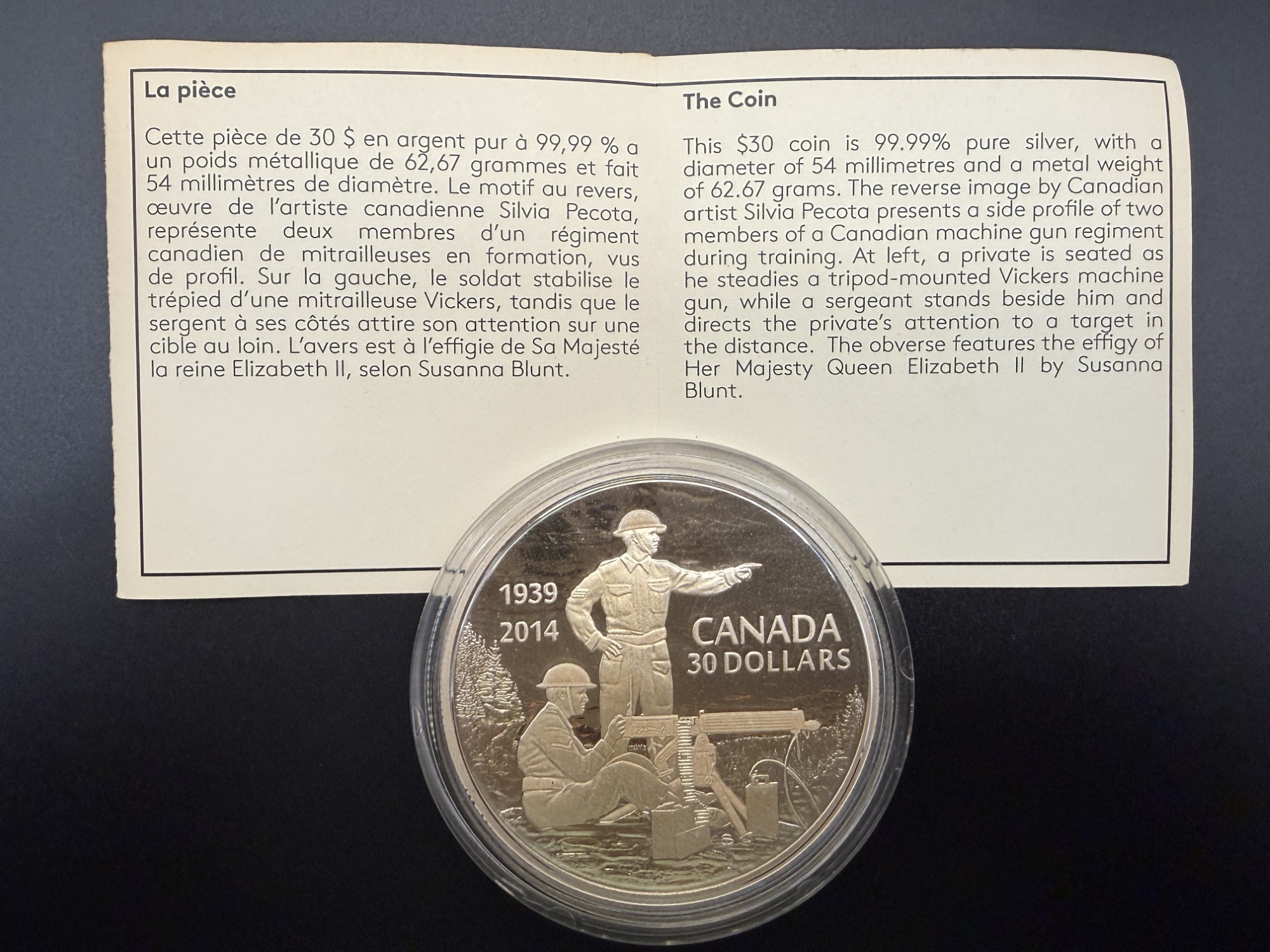 Pièce de collection en argent fin 99,99 %, d’un poids de 2 oz, émise par la Monnaie royale canadienne en 2014 pour commémorer le 75ᵉ anniversaire de la Déclaration de guerre de 1939, moment fondateur de l’engagement militaire canadien durant la Seconde Guerre mondiale. Cette édition met en scène un tireur canadien à l’entraînement, représenté dans un style réaliste et profondément respectueux, capturant la discipline, la préparation et le courage des soldats qui allaient être déployés outre‑mer. Le motif, riche en détails, évoque à la fois l’effort individuel et la mobilisation nationale, tandis que la présentation dans son coffret officiel souligne le caractère premium de cette émission. Avec un tirage limité à seulement 5 000 exemplaires, cette pièce se distingue par sa rareté, sa puissance narrative et sa valeur patrimoniale, en faisant un incontournable pour toute collection consacrée à l’histoire militaire canadienne, aux pièces en argent ou aux commémorations majeures du XXᵉ siècle.
