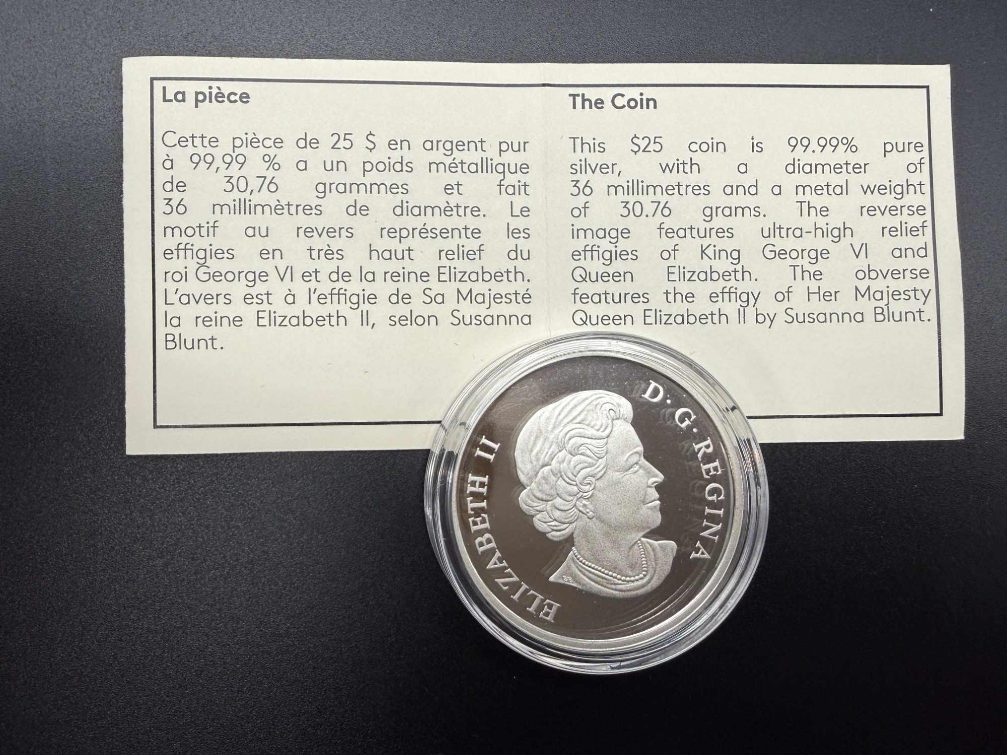 Émise en 2014 par la Monnaie royale canadienne, cette pièce de 25 dollars en argent pur à 99,99 % commémore le 75ᵉ anniversaire de la première visite royale au Canada, événement fondateur dans l’histoire diplomatique du pays. Le revers présente les effigies en très haut relief du roi George VI et de la reine Elizabeth, dans une composition solennelle qui évoque la dignité du protocole monarchique. L’avers arbore l’effigie de Sa Majesté la reine Elizabeth II selon Susanna Blunt. D’un diamètre de 36 mm et d’un poids métallique d’un once troy, cette frappe en épreuve numismatique est strictement limitée à 6000 exemplaires, ce qui en fait une émission hautement prisée pour sa profondeur historique et sa finesse sculpturale. Présentée dans un coffret rouge de velours avec certificat d’authenticité bilingue, elle incarne une mémoire gravée de la souveraineté partagée, où l’histoire devient hommage et la gravure, témoignage.
