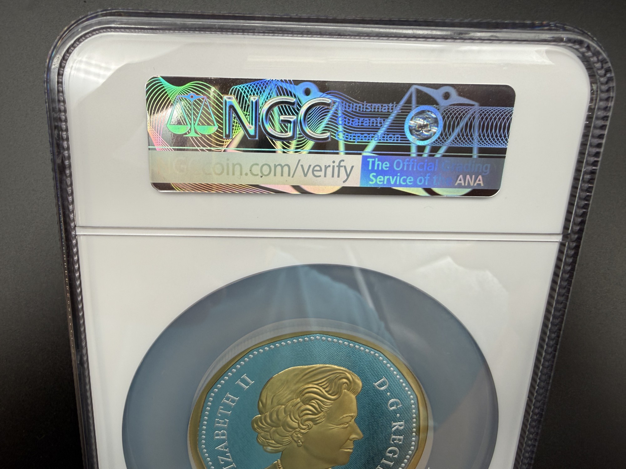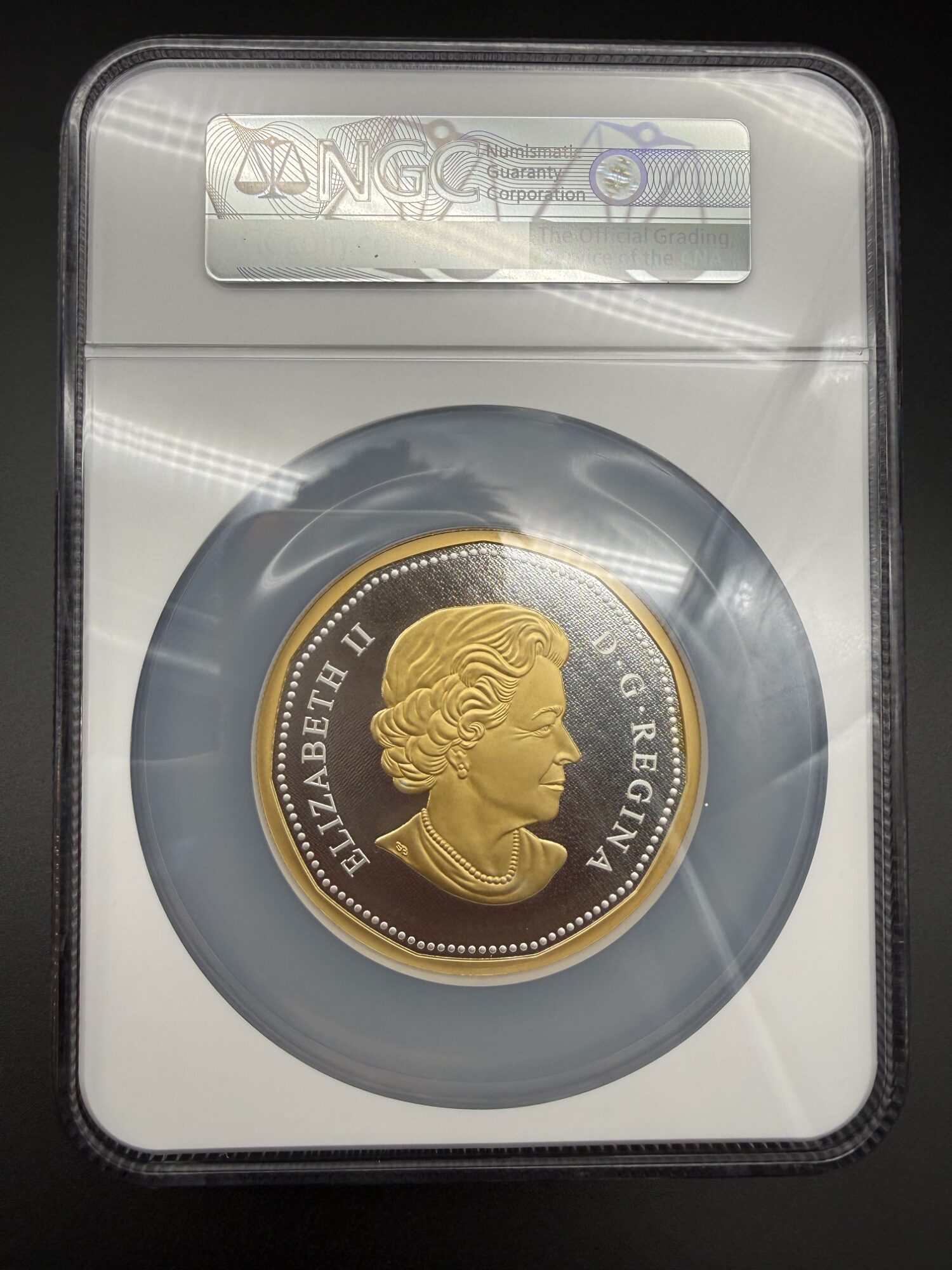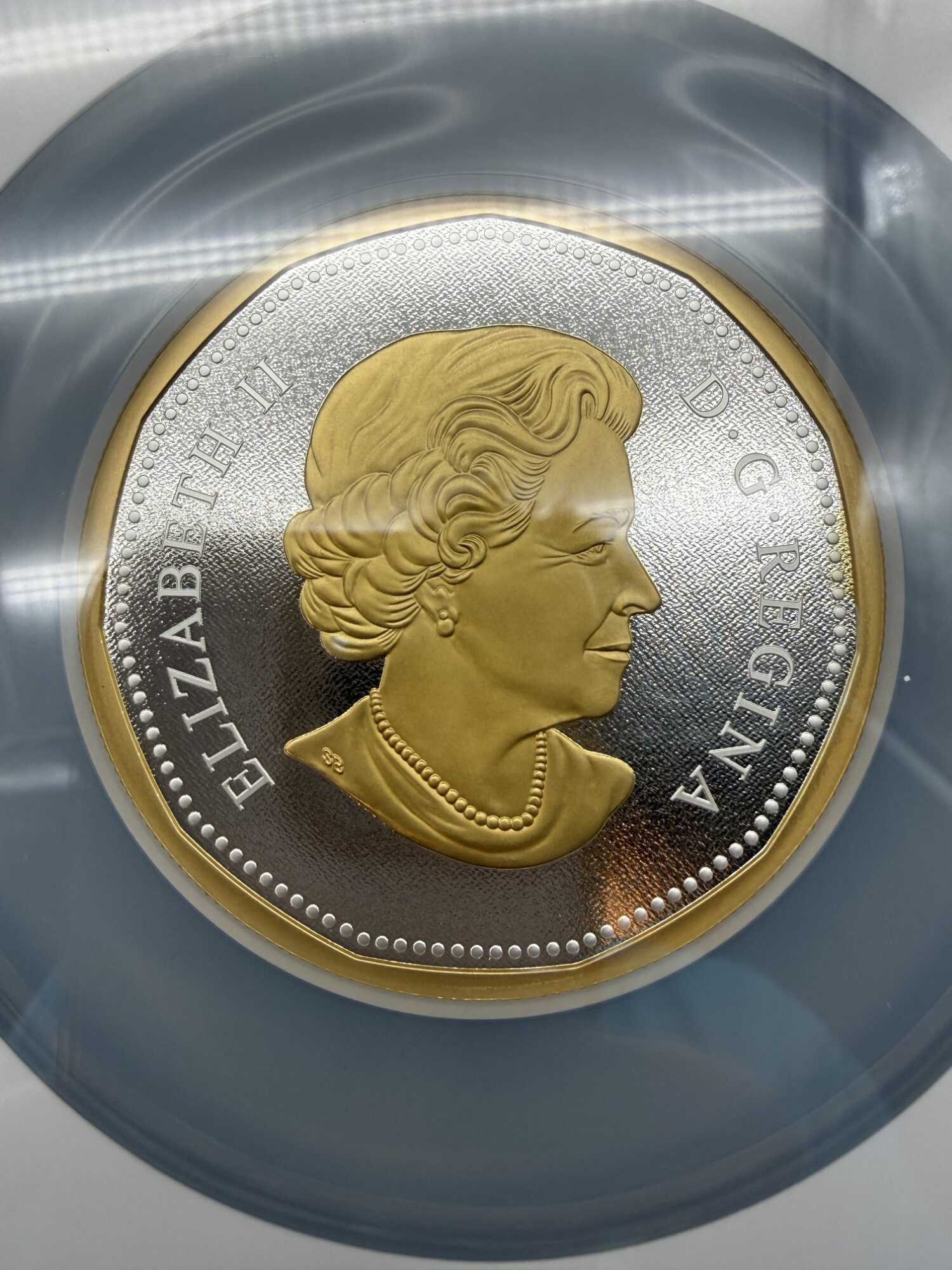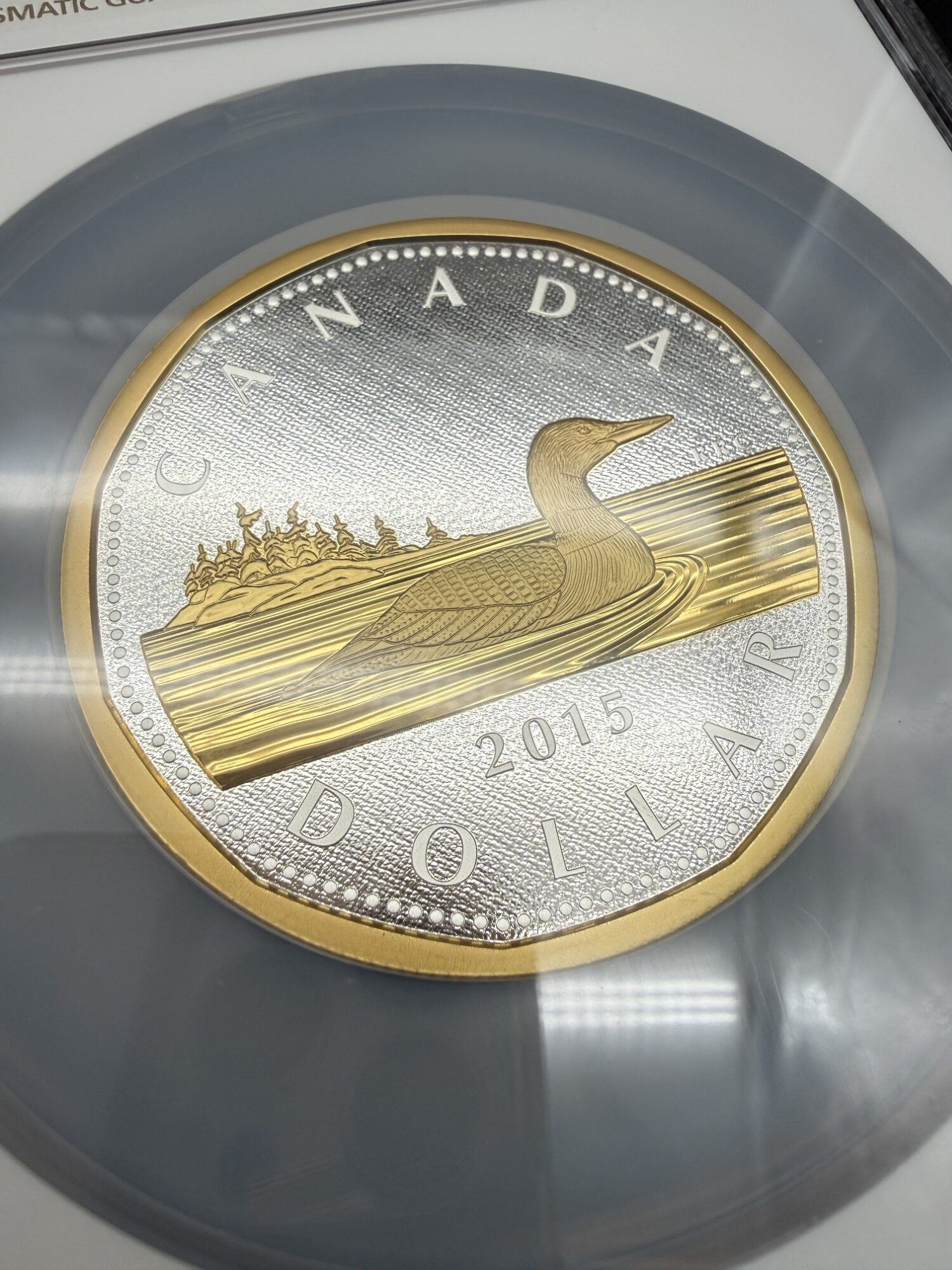 Émise en 2015 dans la prestigieuse série “Grande Taille”, cette pièce de 1 dollar en argent pur à 99,99 % transpose l’icône nationale du Loonie dans une version monumentale de cinq onces troy. Le revers reprend fidèlement le huard glissant sur les eaux calmes du Nord canadien, mais dans une interprétation spectaculaire : les éléments clés du motif, le huard, les reflets, les détails du rivage sont sublimés par un placage d’or 24 K, appliqué avec une précision exceptionnelle. Ce contraste entre l’argent poli et l’or profond crée une présence visuelle saisissante, presque sculpturale. L’avers, également rehaussé d’or, arbore l’effigie de Sa Majesté la reine Elizabeth II selon Susanna Blunt. L’ensemble est frappé en épreuve numismatique, révélant un relief net, des champs miroirs et une finition digne des plus grandes productions de la Monnaie royale canadienne. Avec un tirage mondial strictement limité à 1 500 exemplaires, cette édition se classe parmi les pièces les plus rares et les plus convoitées de la série. L’exemplaire ici présenté est certifié NGC PF69 Ultra Cameo, un grade qui frôle la perfection absolue, scellé dans un étui polymère inviolable garantissant sa préservation à long terme. Cette pièce incarne une mémoire gravée de l’identité canadienne, où le huard devient totem national, l’or devient lumière, et le format monumental transforme une monnaie familière en artefact patrimonial.