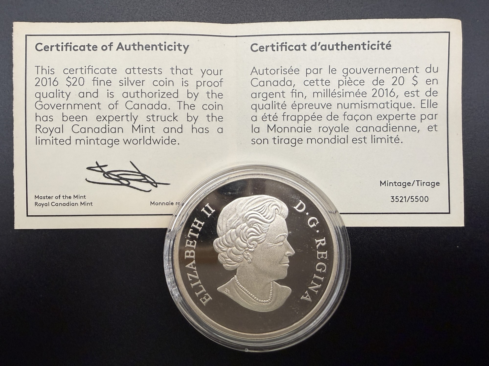 Émise en 2016, cette pièce en argent pur 99,99 %, d’un poids de 1 oz, s’inscrit dans la série Petits du monde animal, dédiée aux espèces emblématiques du territoire canadien. Le motif met en scène un caribou en milieu forestier, rendu avec une coloration subtile qui rehausse la texture du pelage et la profondeur du paysage. La gravure argentée, combinée à la couleur sélective, crée un équilibre visuel qui évoque la noblesse et la résilience de cet animal emblématique du Nord. Présentée dans son coffret officiel, la pièce affirme son statut d’objet d’art naturaliste, conçue pour la contemplation et la collection. Avec un tirage limité à 5 500 exemplaires, elle se distingue par sa rareté et par la finesse de son traitement, rejoignant les pièces fauniques les plus recherchées de la MRC.