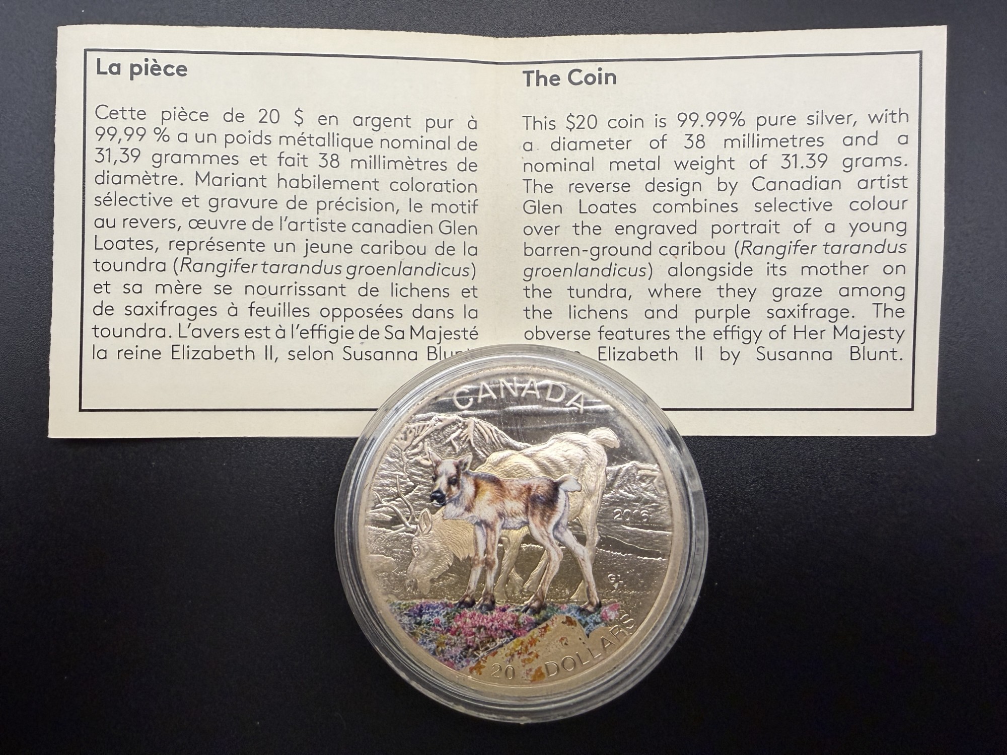 Pièce de 20 Dollars colorée de 1 oz en argent pur – “Petits du monde animal : Le caribou” 2016
