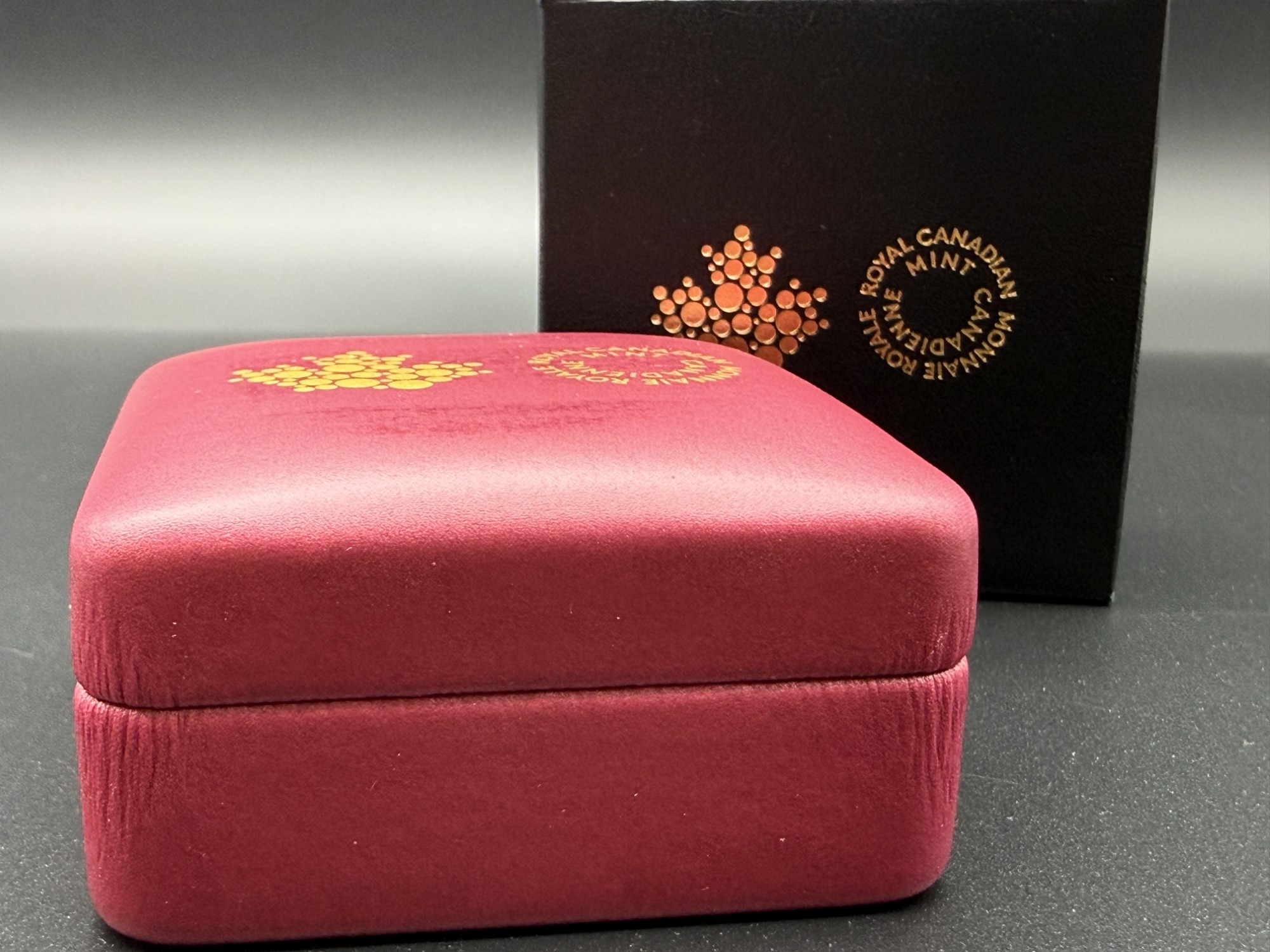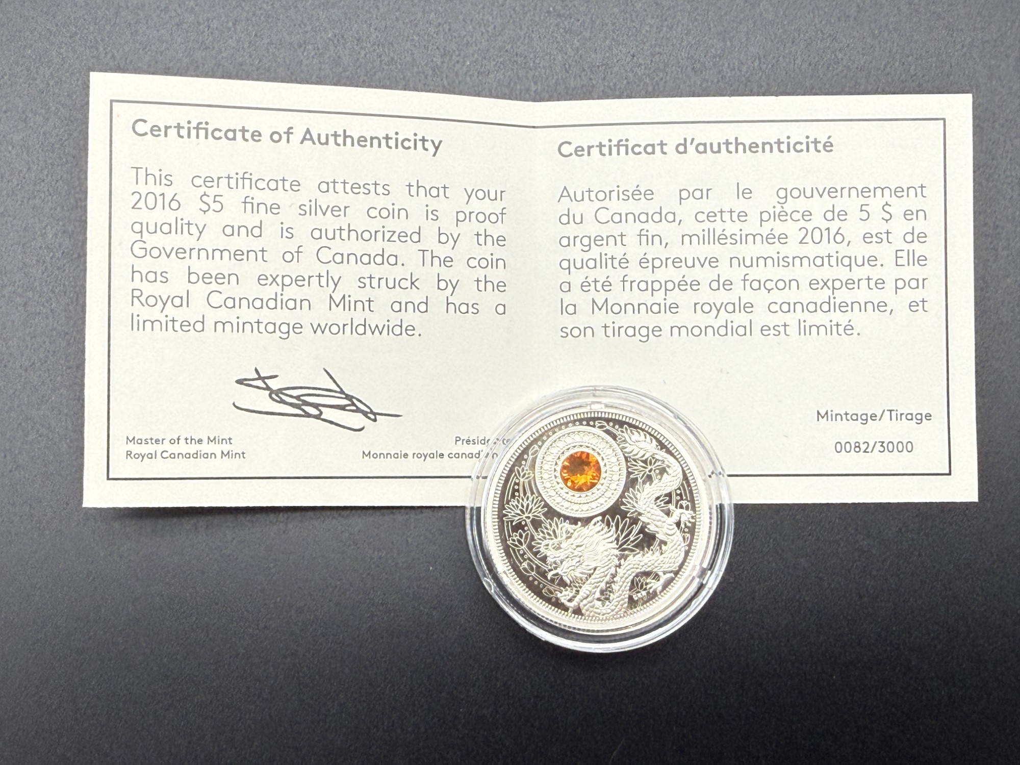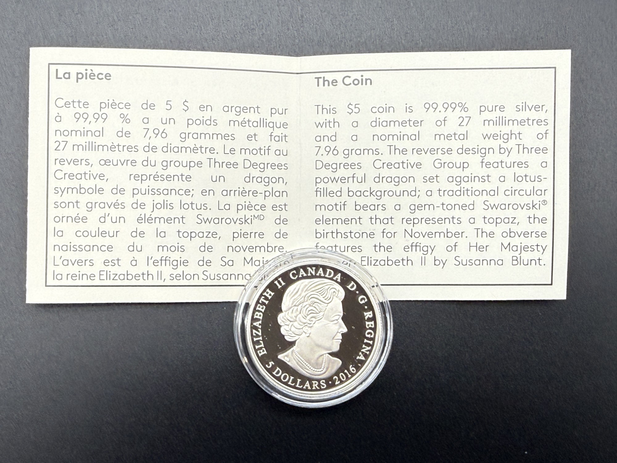 Émise en 2016 par la Monnaie royale canadienne, cette pièce de 5 dollars en argent pur à 99,99 % célèbre le mois de novembre à travers un dragon stylisé gravé sur fond de lotus, symbole de force et de renouveau. Un cristal Swarovski couleur topaze, pierre de naissance associée à ce mois, est enchâssé au cœur du motif. L’avers présente l’effigie de Sa Majesté la reine Elizabeth II selon Susanna Blunt. D’un diamètre de 27 mm et contenant 7,96 g d’argent pur, cette création numismatique est strictement limitée à 3000 exemplaires. Livrée dans son coffret rouge à doublure de velours avec certificat d’authenticité bilingue, elle conjugue symbolisme personnel et raffinement patrimonial
