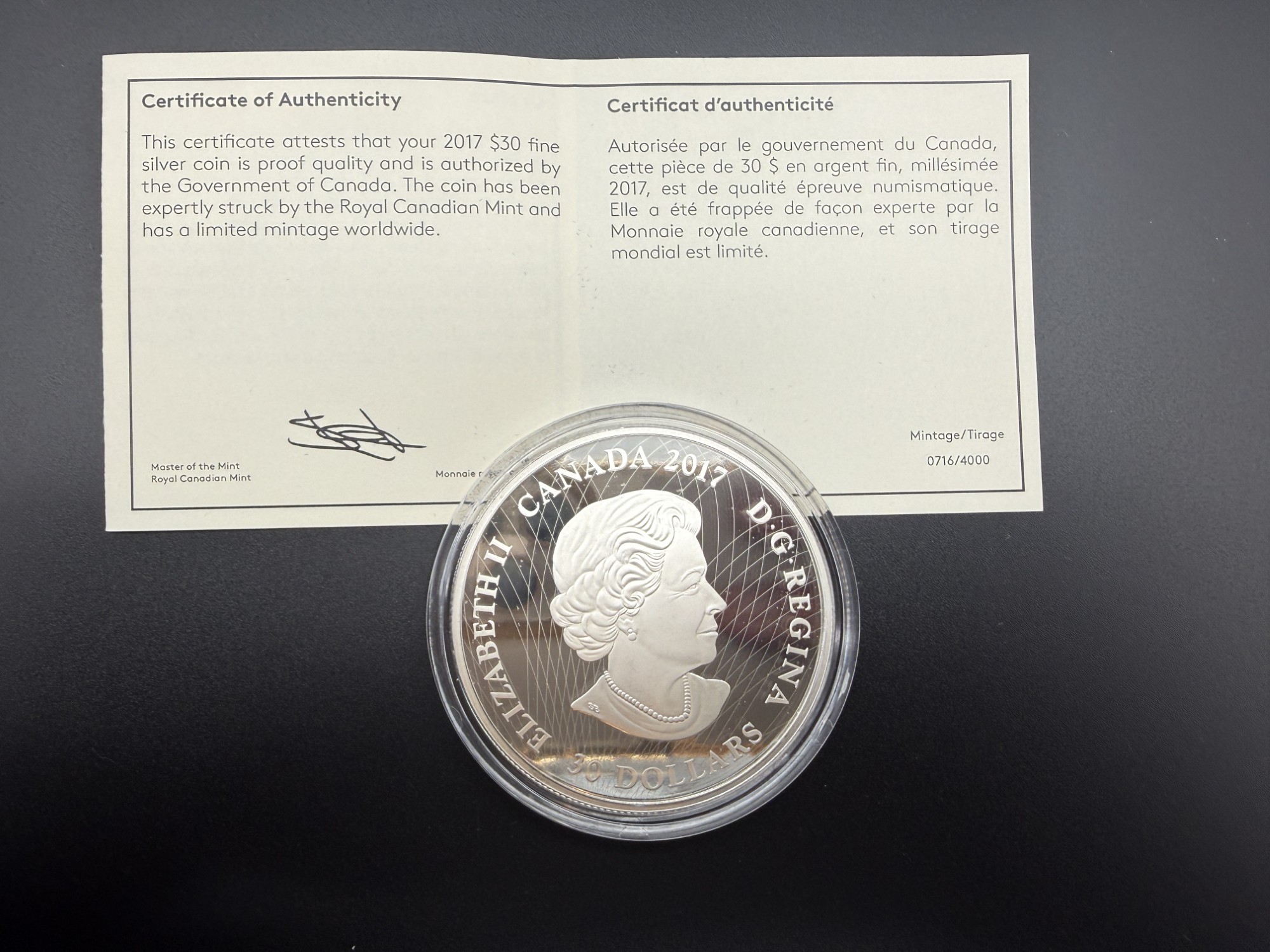 Émise en 2017 par la Monnaie royale canadienne, cette pièce de 30 dollars en argent pur à 99,99 % appartient à la catégorie des frappes grand format, réalisée sur 2 onces troy d’argent fin. Le revers présente un couguar solitaire s’approchant d’un ruisseau sur un rivage enneigé de la côte Pacifique sous un ciel étoilé et une lune qui, dans l’obscurité, brillent réellement, révélant un scintillement discret sur l’eau et la neige. L’avers arbore l’effigie de Sa Majesté la reine Elizabeth II selon Susanna Blunt. D’un diamètre de 54 mm, cette frappe en épreuve numismatique est strictement limitée à 4000 exemplaires, ce qui en fait une émission hautement prisée pour sa dimension immersive et sensorielle. Présentée dans son coffret rouge de conservation avec certificat d’authenticité bilingue, elle incarne une mémoire gravée du vivant, où le silence du prédateur devient poésie lunaire.