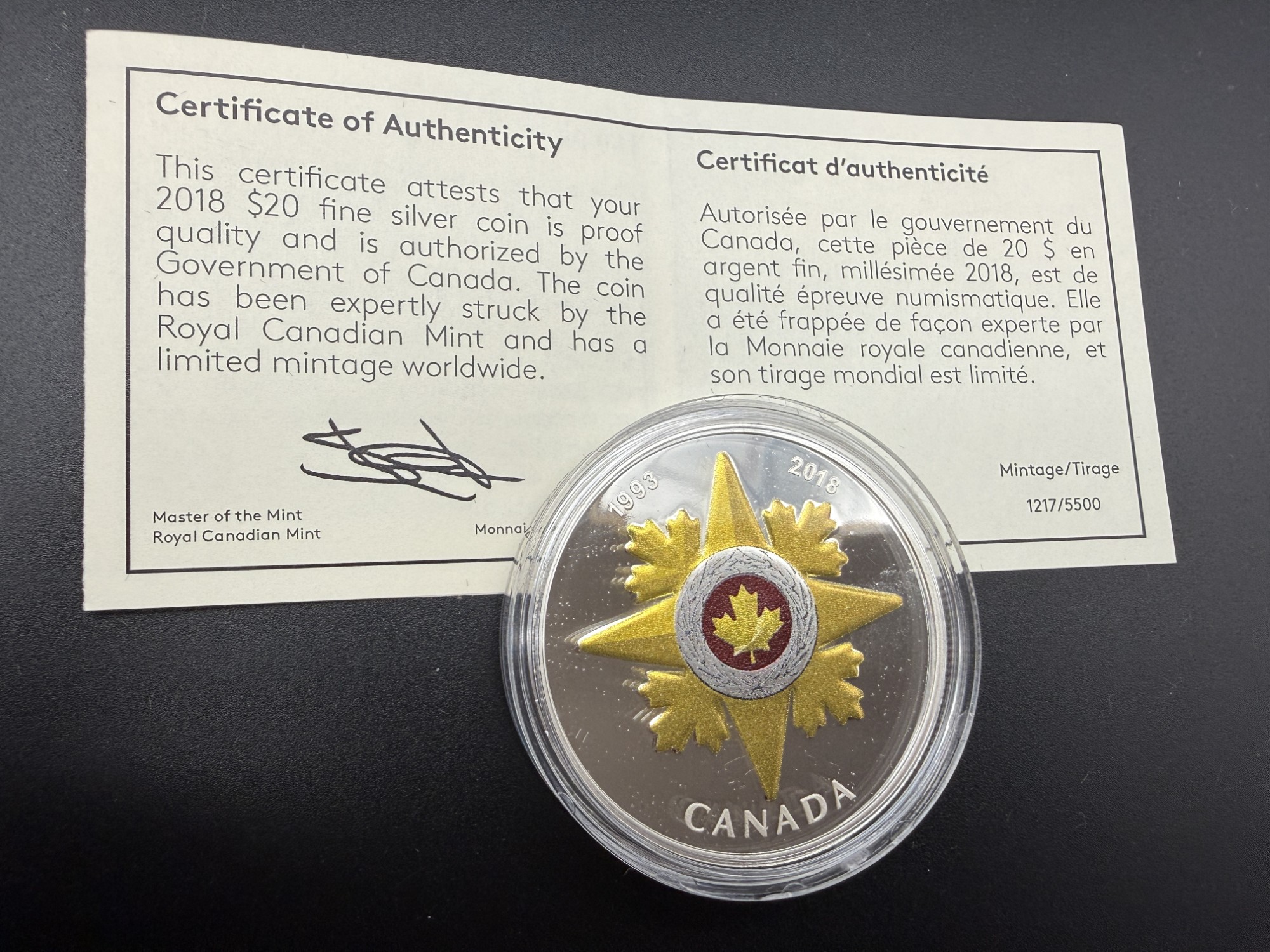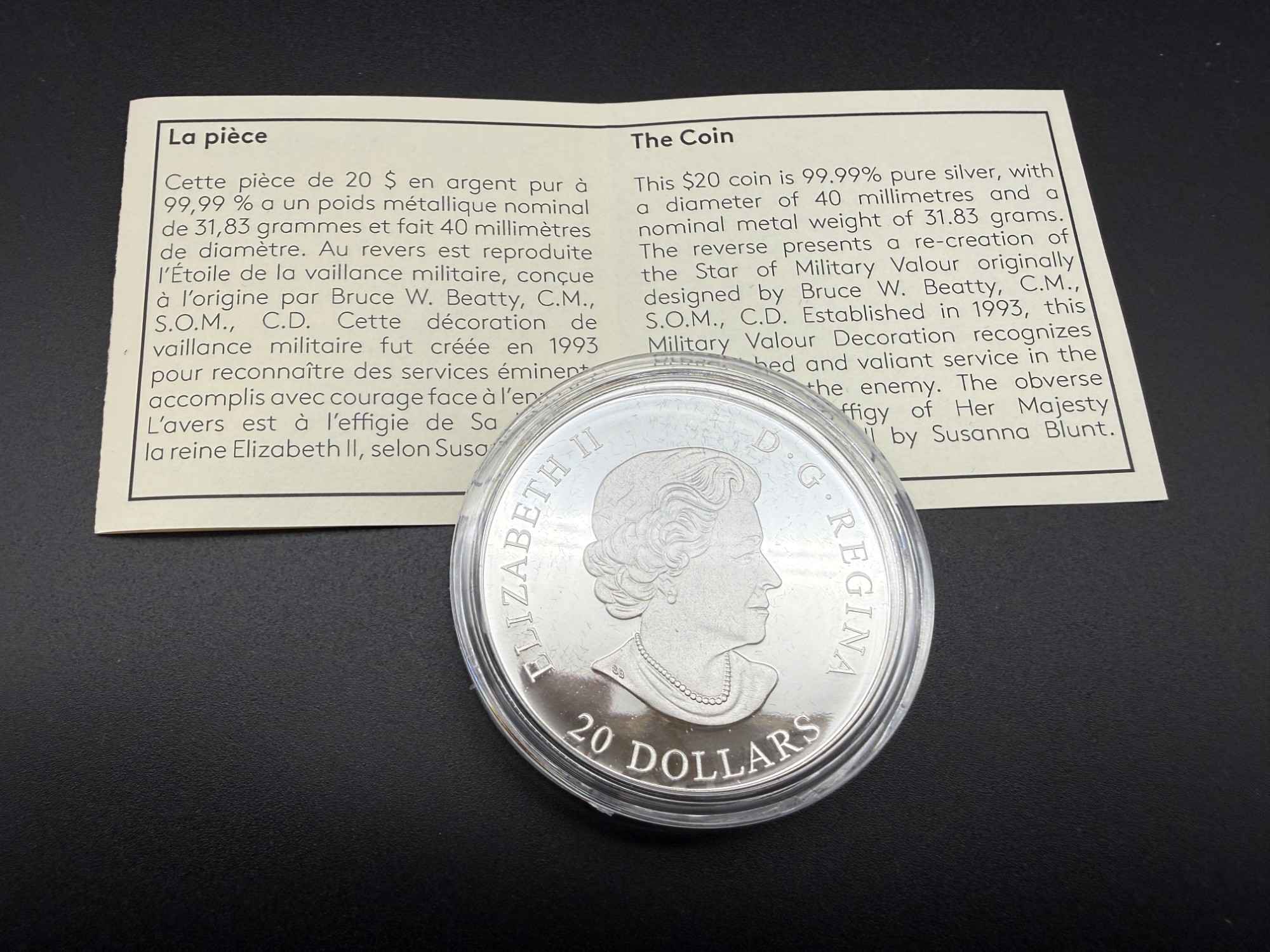 Frappée en 2018 par la Monnaie Royale Canadienne, cette pièce de 20 dollars en argent pur possède une teneur exacte de 1 oz. troy d’argent fin et rend hommage à l’Étoile de la vaillance militaire, distinction honorifique créée en 1993 pour reconnaître les actes de bravoure accomplis en présence de l’ennemi. Le revers présente une réinterprétation de l’insigne, avec une feuille d’érable rouge centrale entourée d’un motif doré en étoile, soulignant l’honneur et le courage. Tirée à seulement 5 500 exemplaires, cette frappe se distingue par son exclusivité commémorative, prisée pour sa portée symbolique et son raffinement technique. Présentée dans son coffret de collection et accompagnée de son certificat d’authenticité, elle s’impose comme une pièce solennelle où l’argent pur célèbre l’héroïsme canadien.