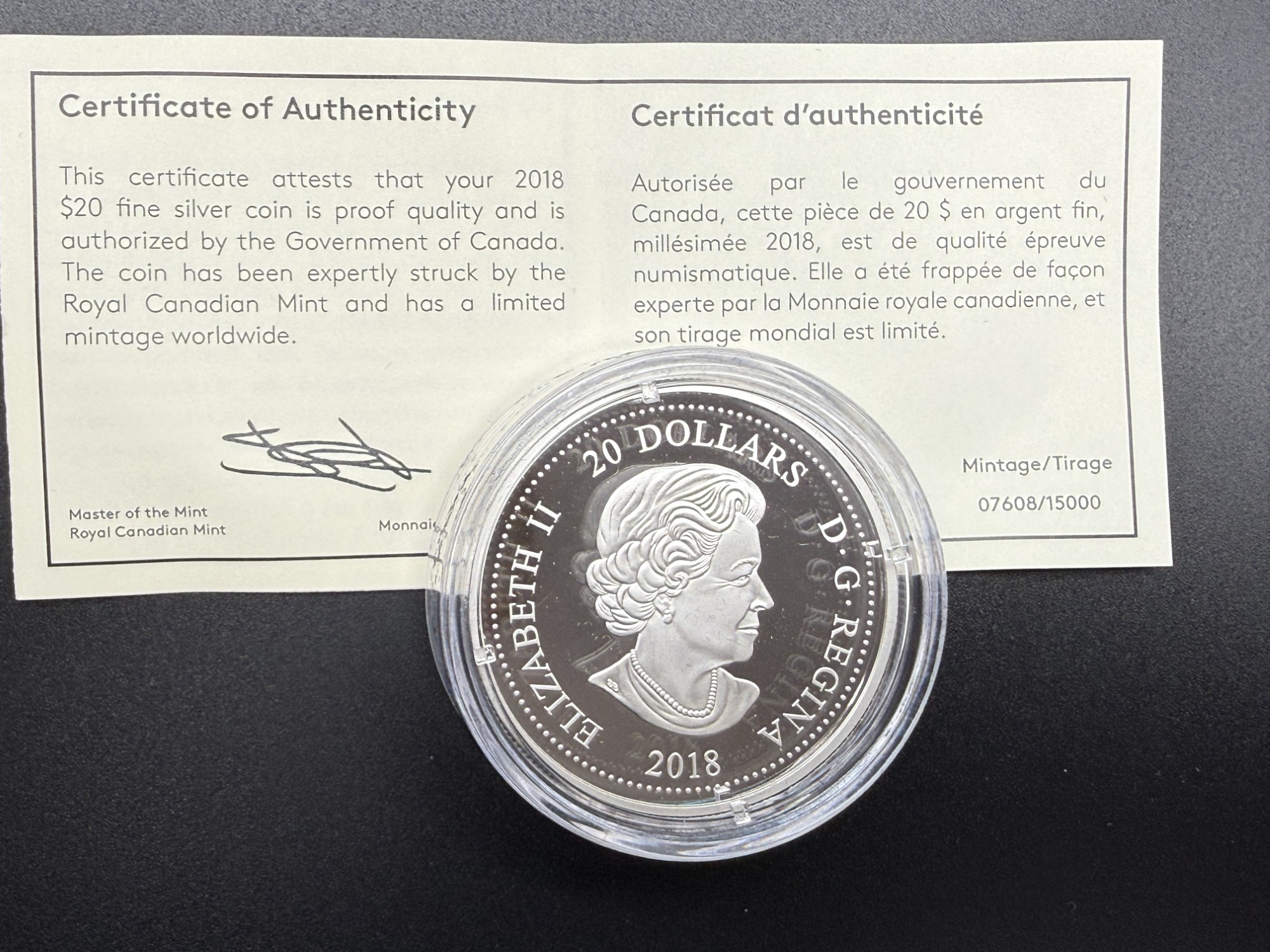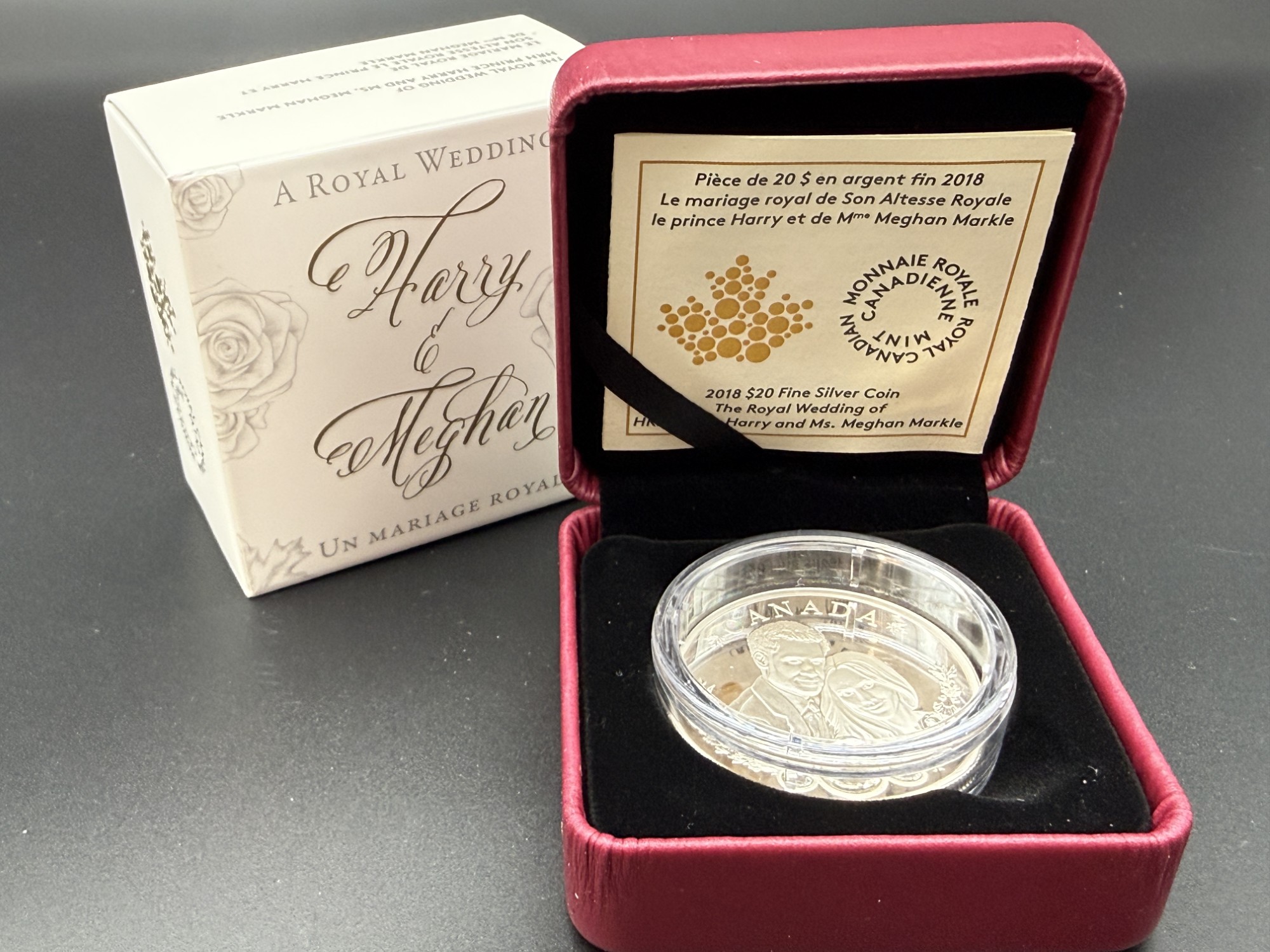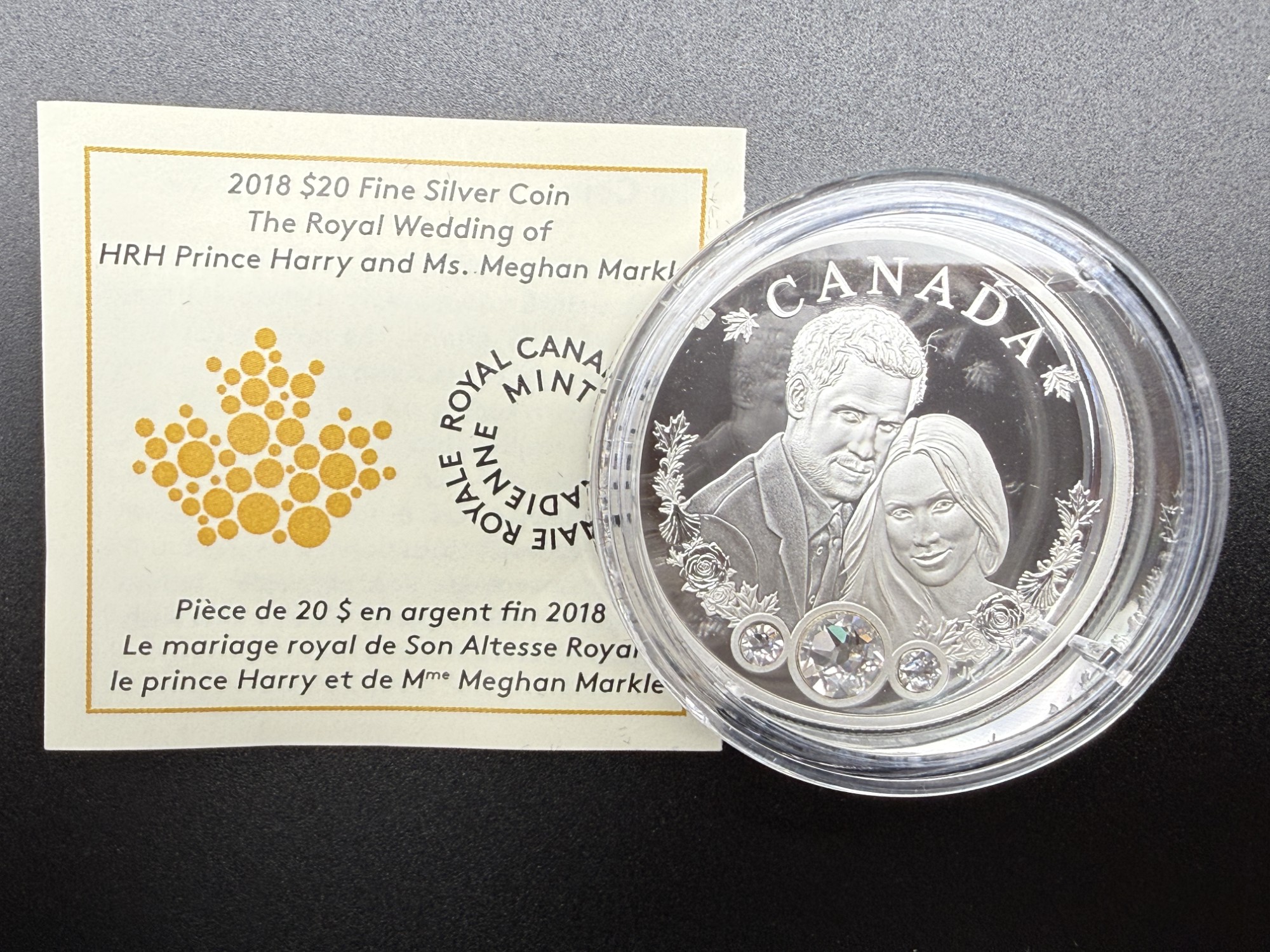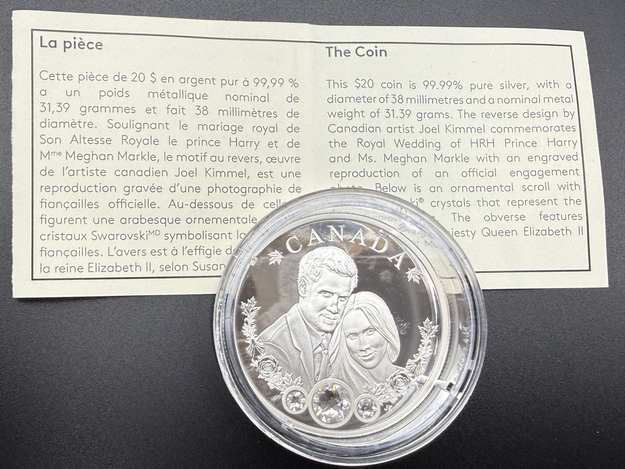 Émise en 2018 par la Monnaie royale canadienne, cette pièce de 20 dollars en argent pur à 99,99 % célèbre le mariage royal de Son Altesse Royale le prince Harry et de Mme Meghan Markle à travers une reproduction gravée d’une photographie officielle de fiançailles, encadrée d’une arabesque ornementale et sertie de cristaux Swarovski® symbolisant la bague. D’un diamètre de 38 mm et d’un poids nominal d’une once troy, cette frappe en épreuve numismatique est strictement limitée à 15 000 exemplaires, seuil qui la classe parmi les émissions commémoratives recherchées, prisée pour sa charge émotionnelle et sa finesse décorative. L’avers présente l’effigie de Sa Majesté la reine Elizabeth II selon Susanna Blunt. Présentée dans un coffret rouge de velours avec certificat d’authenticité bilingue, cette pièce incarne une mémoire gravée du romantisme royal, où la gravure devient hommage et le cristal, éclat d’un serment.