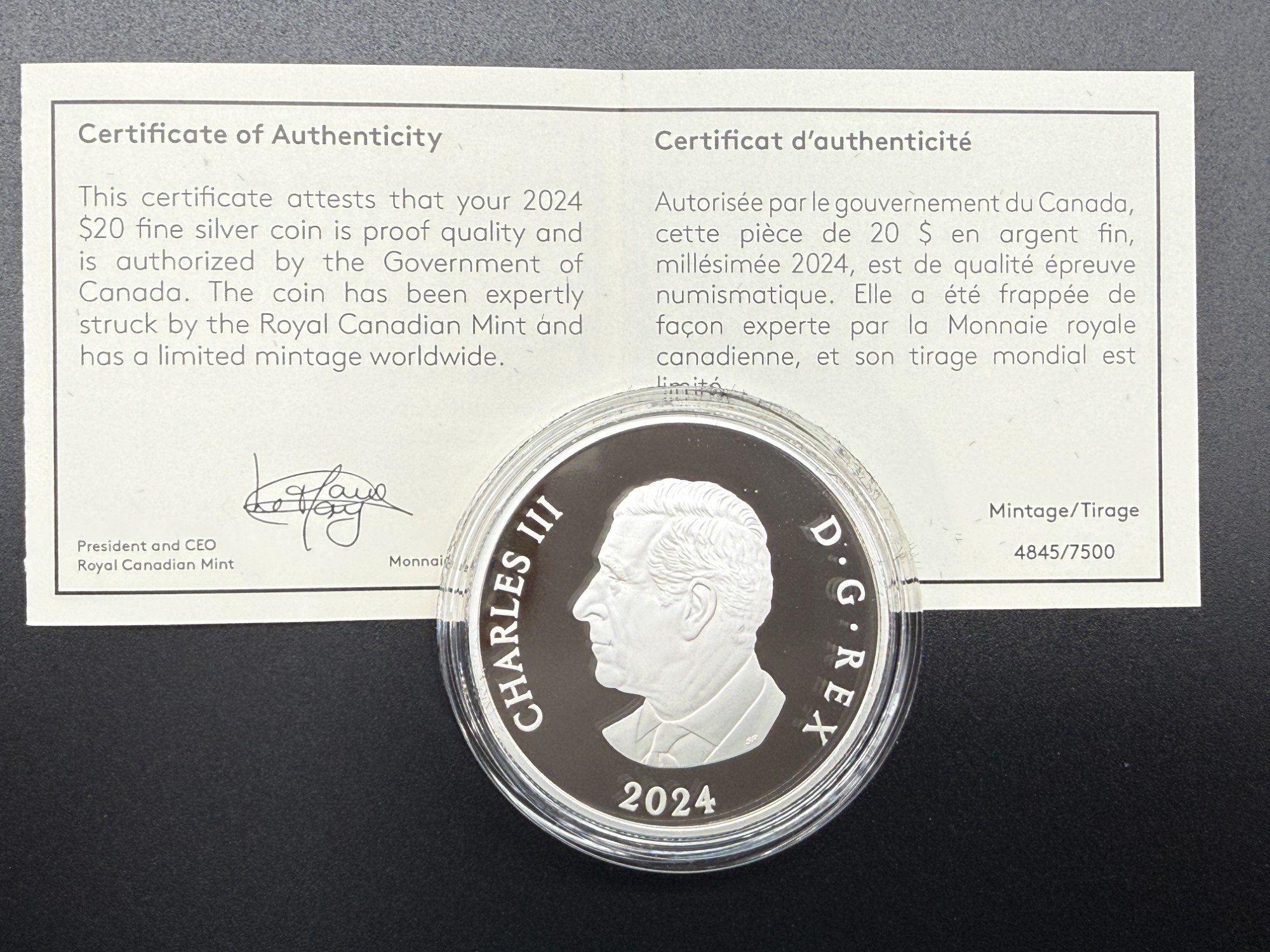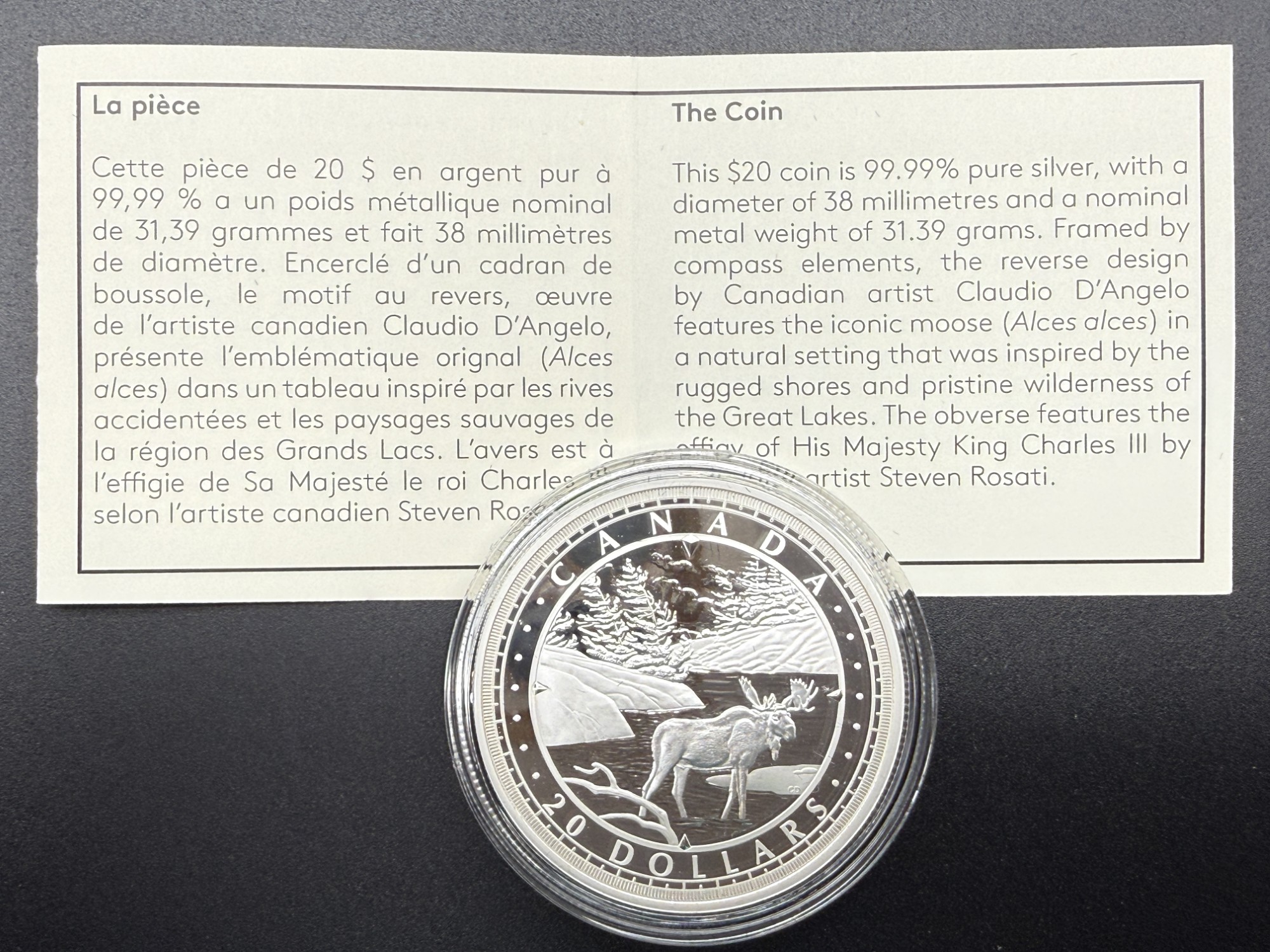 Émise en 2024 par la Monnaie royale canadienne, cette pièce de 20 dollars en argent pur à 99,99 % rend hommage à la majesté des Grands Lacs dans une composition naturaliste signée par l’artiste Claudio D’Angelo. Le revers, encadré d’un cadran de boussole, présente un orignal dans un paysage inspiré des rives accidentées et des étendues sauvages de la région, emblème de la faune canadienne et de son lien avec les eaux intérieures. L’avers arbore l’effigie de Sa Majesté le roi Charles III, œuvre de Steven Rosati. D’un diamètre de 38 mm et d’un poids nominal d’une once troy, cette frappe en épreuve numismatique est strictement limitée à 7500 exemplaires, ce qui en fait une émission hautement prisée pour sa portée écologique et sa gravure immersive. Présentée dans un coffret noir de velours avec certificat d’authenticité bilingue, elle incarne une mémoire gravée du territoire lacustre, où la nature devient récit et la gravure, hommage.