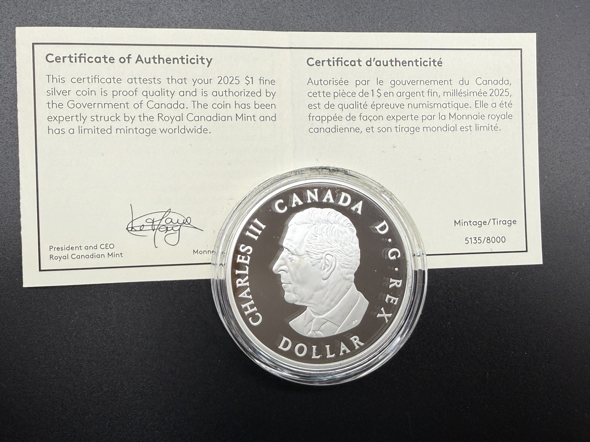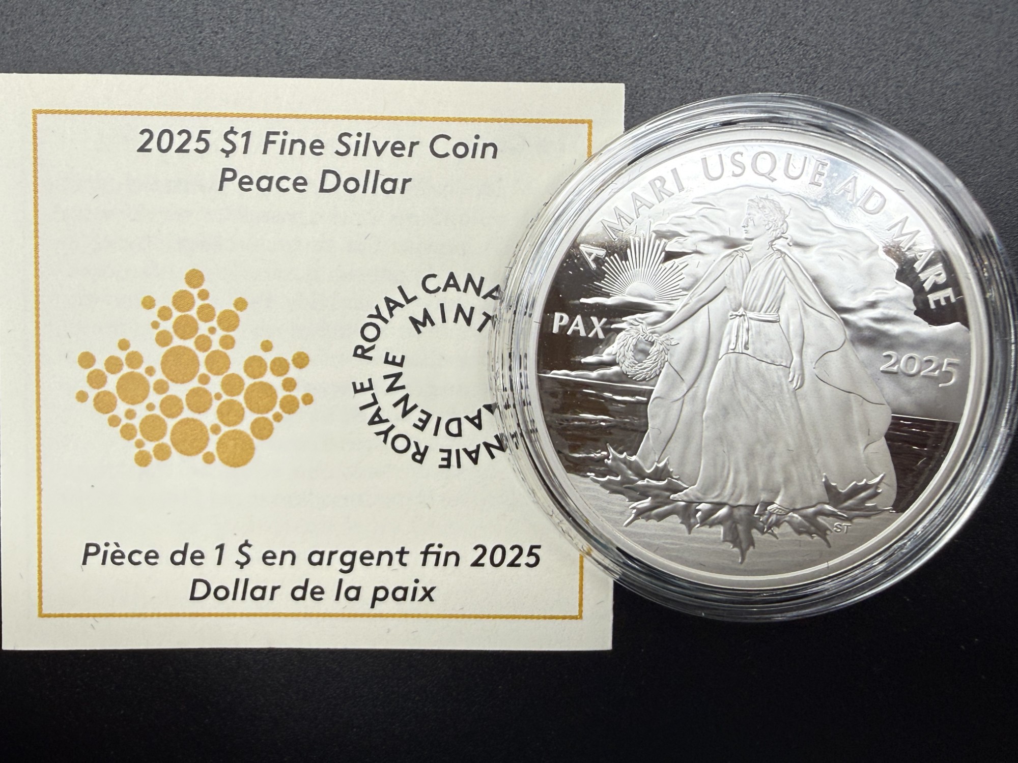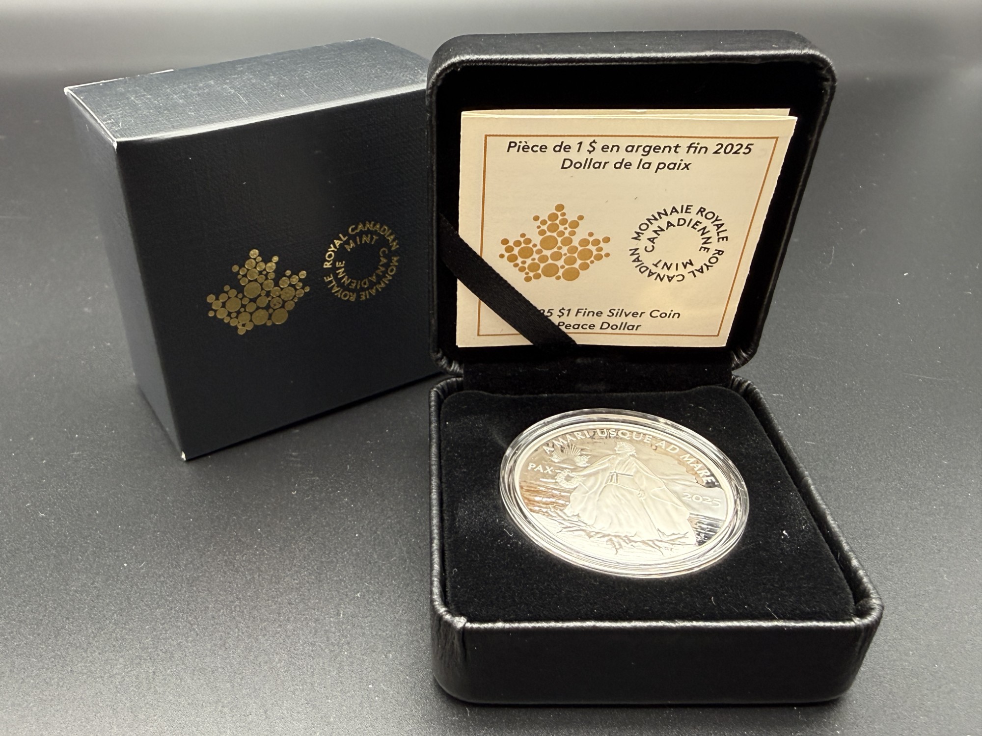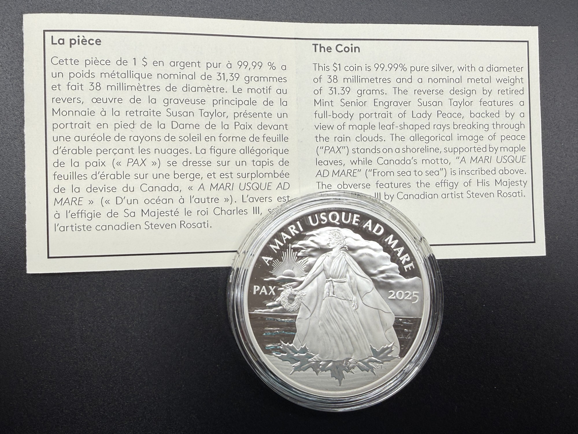 Émise en 2025 par la Monnaie royale canadienne, cette pièce de 1 dollar en argent pur à 99,99 % incarne l’aspiration universelle à la paix à travers une allégorie lumineuse. Le revers, signé par la graveuse principale à la retraite Susan Taylor, présente Lady Peace debout sur une berge, entourée de feuilles d’érable, tandis que des rayons en forme de feuille percent les nuages. L’inscription PAX renforce le message de sérénité et d’unité. L’avers arbore l’effigie de Sa Majesté le roi Charles III, œuvre de Steven Rosati. D’un diamètre de 38 mm et d’un poids nominal d’une once troy, cette frappe en épreuve numismatique est strictement limitée à 8000 exemplaires, ce qui en fait une émission hautement prisée pour sa symbolique universelle et sa gravure majestueuse. Présentée dans un coffret noir de velours avec certificat d’authenticité bilingue, elle incarne une mémoire gravée de l’idéal pacifique, où l’art devient message et la gravure, serment.