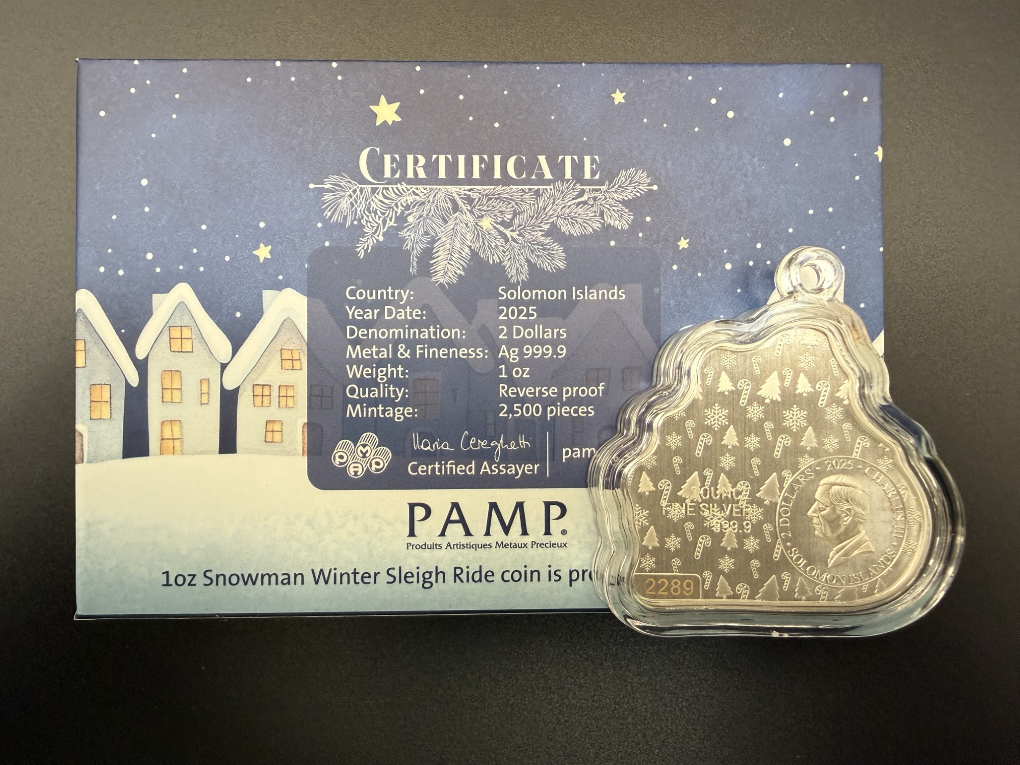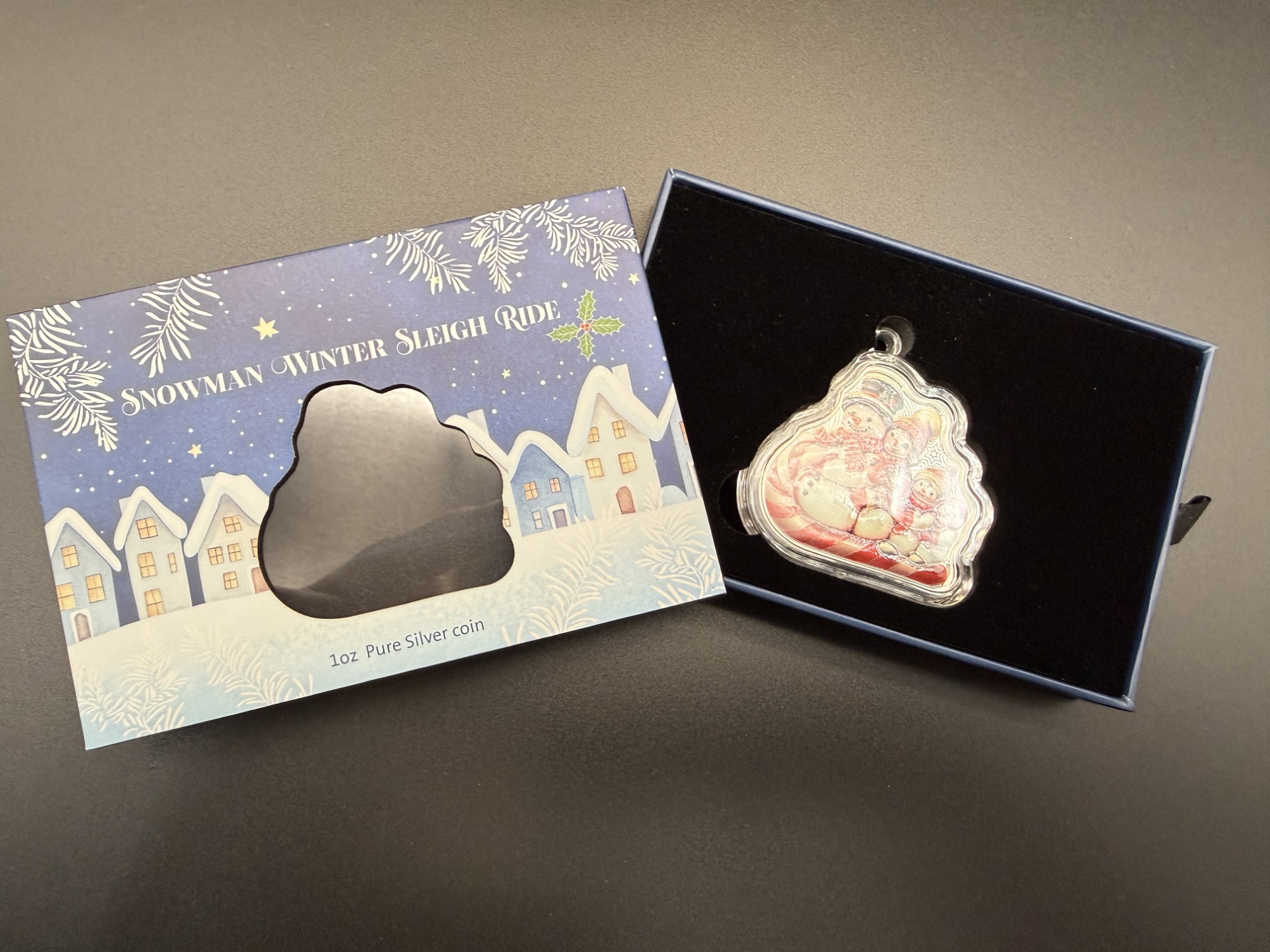 Émise pour 2025 sous l’autorité monétaire des Îles Salomon et produite par PAMP Suisse, cette pièce de 1 oz en argent pur 99,99 % adopte une forme découpée et un traitement coloré qui évoquent l’univers chaleureux des scènes hivernales. Le motif “Snowman Winter Ride” présente un bonhomme de neige stylisé dans une composition festive, où la précision du découpage et la vivacité des couleurs rappellent le savoir‑faire artisanal propre aux éditions saisonnières de PAMP. Présentée dans son coffret hivernal officiel, elle s’impose comme un objet de collection à la fois ludique et raffiné, conçu pour célébrer l’imaginaire des fêtes avec une élégance contemporaine. Avec un tirage strictement limité à 2 500 exemplaires, cette émission se distingue par sa rareté et par la qualité irréprochable de sa réalisation, rejoignant les pièces thématiques les plus recherchées du segment “Winter Editions”.