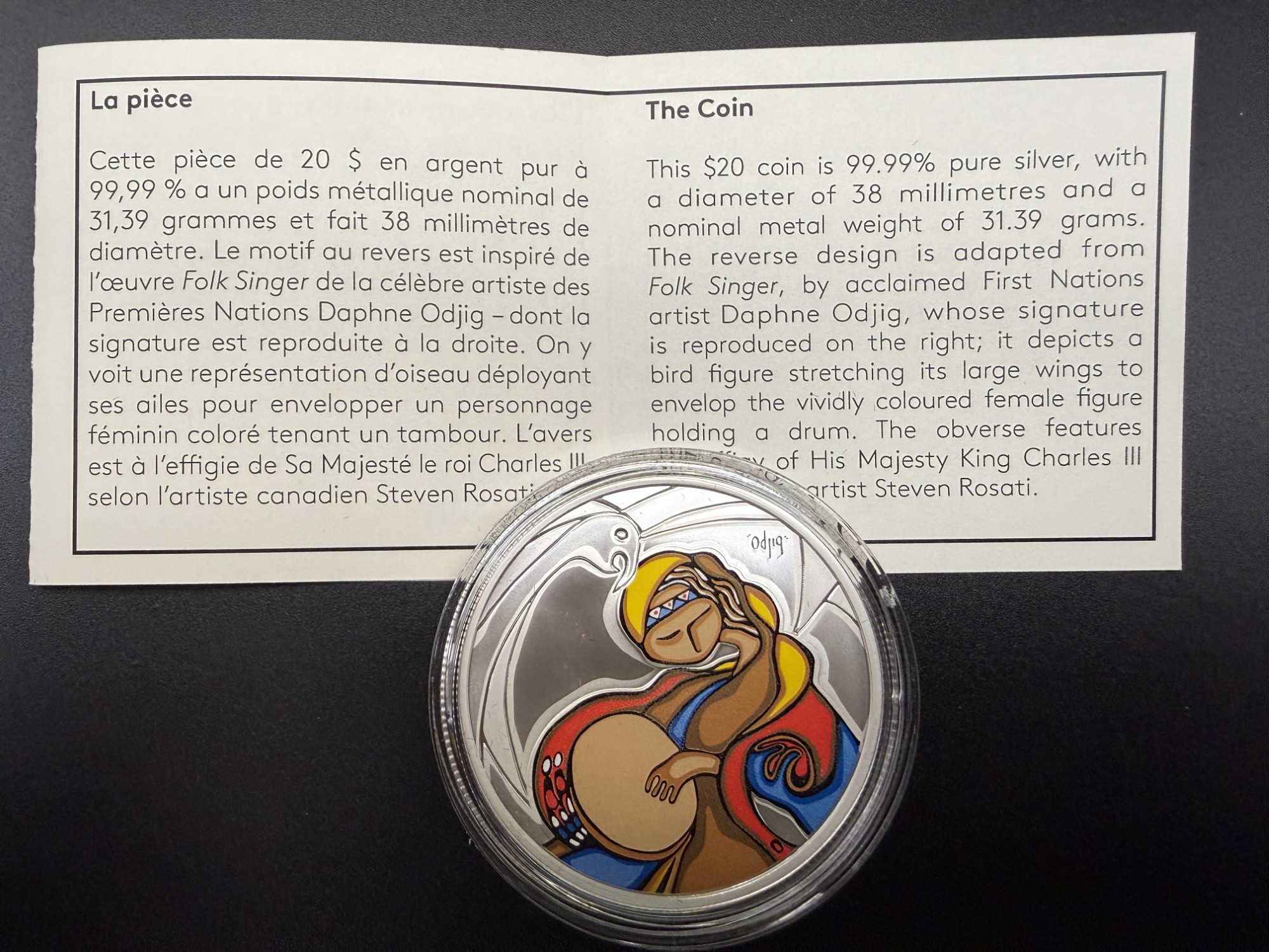 Émise en 2025, cette pièce en argent fin 99,99 %, d’un poids de 1 oz troy, rend hommage à l’œuvre Folk Singer de Daphne Odjig, figure majeure de l’art autochtone canadien et cofondatrice du mouvement Professional Native Indian Artists Inc. Le revers présente une adaptation fidèle de son langage visuel : un oiseau protecteur déployant ses ailes autour d’une figure féminine au tambour, dans une composition vibrante où couleurs, formes courbes et symbolisme spirituel se répondent. La signature de l’artiste, reproduite sur la pièce, renforce son caractère d’hommage officiel. L’avers porte l’effigie de Sa Majesté le roi Charles III, selon le portrait de l’artiste canadien Steven Rosati, affirmant l’ancrage contemporain de cette émission. Avec un tirage limité à 7 500 exemplaires, cette pièce s’impose comme un objet d’art numismatique, célébrant à la fois la création autochtone et le savoir‑faire de la MRC.