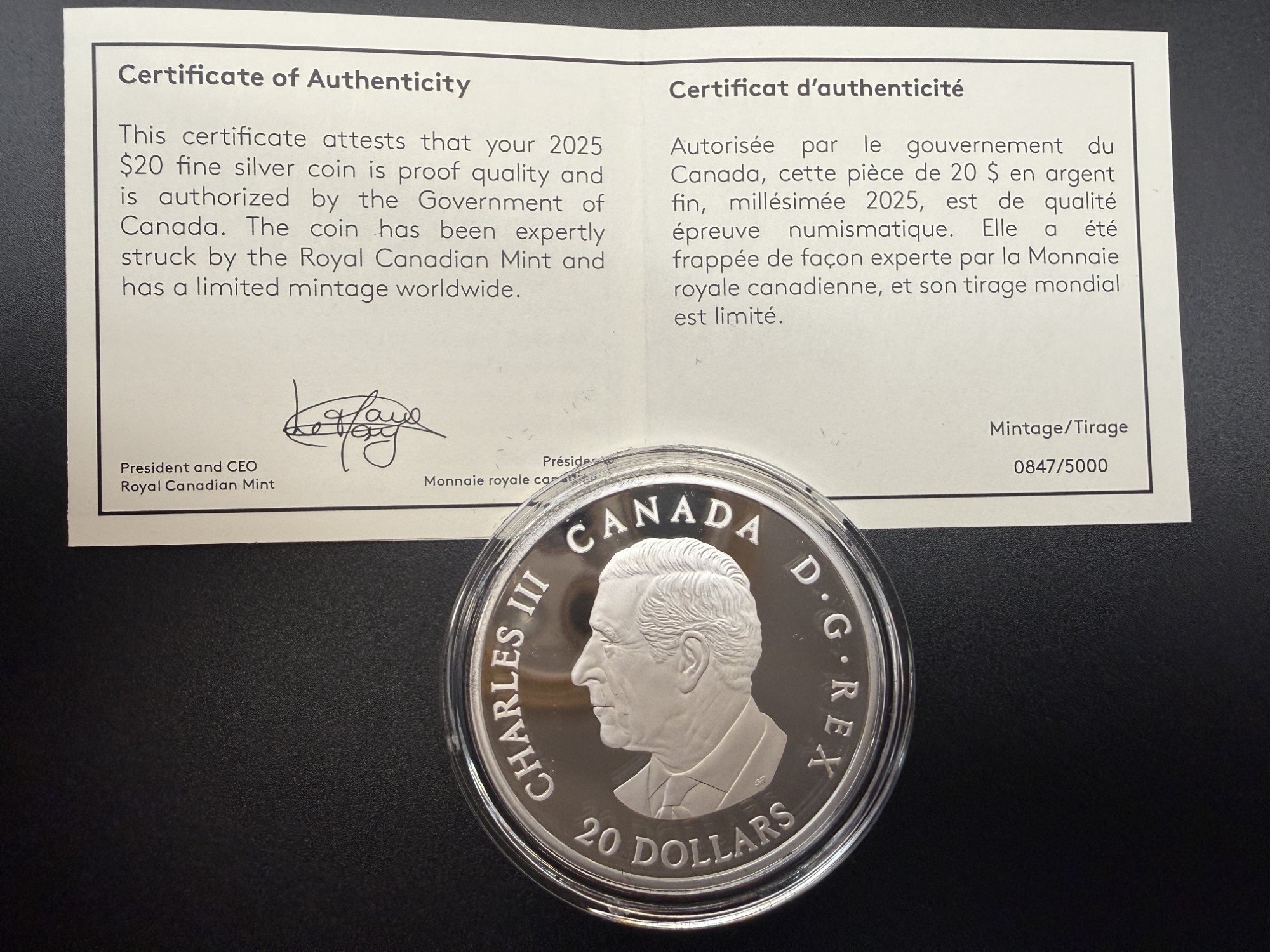Cette pièce de 1 oz en argent fin 2025, consacrée à la légende du capteur de rêves, s’impose comme l’une des créations les plus symboliques et les plus narratives de la Monnaie royale canadienne. Gravée avec une minutie presque cérémonielle, elle réunit les éléments essentiels du capteur de rêves ; cercle protecteur, tissage sacré, plumes, motifs floraux, dans une composition qui évoque autant la tradition que la transmission. Le dessin, riche et fluide, s’organise autour d’une iconographie inspirée des cultures autochtones, où le capteur agit comme un gardien nocturne, filtrant les mauvais rêves pour ne laisser passer que la lumière. Avec un tirage strictement limité à 5 000 exemplaires, chaque pièce devient un objet de rareté immédiate, un artefact contemporain qui marie spiritualité, art narratif et excellence numismatique. Présentée dans son écrin, elle se lit comme une œuvre d’argent pur : un hommage à la mémoire, à la protection et à la beauté des traditions qui traversent le temps.