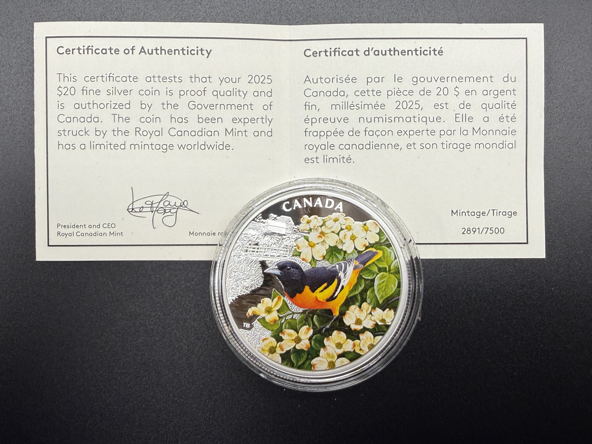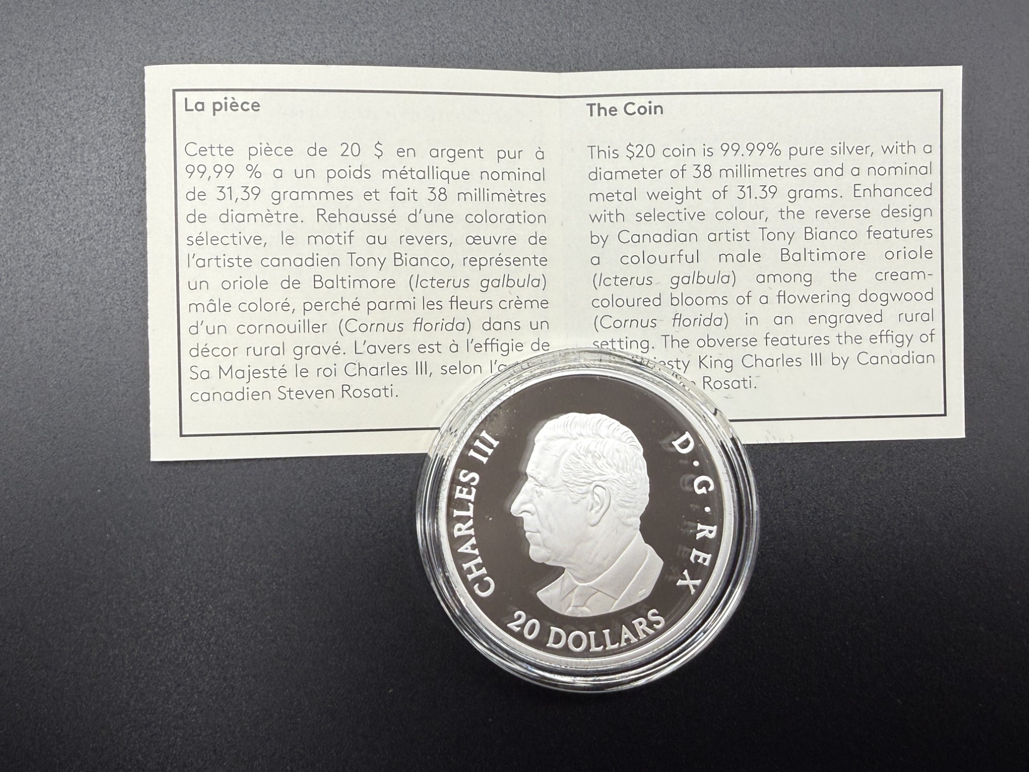 Émise en 2025 par la Monnaie royale canadienne, cette pièce de 20 dollars en argent pur s’inscrit dans la série « Oiseaux colorés » en tant qu’évocation naturaliste et patrimoniale du Baltimore oriole ici représenté dans toute sa vivacité chromatique, perché parmi les fleurs crème d’un cornouiller en décor rural gravé; le motif au revers, signé par l’artiste canadien Tony Bianco, est rehaussé d’une coloration sélective, tandis que l’avers présente l’effigie inaugurale de Sa Majesté le roi Charles III. D’un diamètre de 38 mm et d’un poids nominal de 31,39 g, cette frappe en épreuve numismatique est strictement limitée à 7500 exemplaires et livrée dans son coffret noir de conservation avec certificat d’authenticité bilingue, elle incarne une miniature ornithologique digne des cabinets de curiosités, où l’art du graveur dialogue avec la mémoire du vivant.