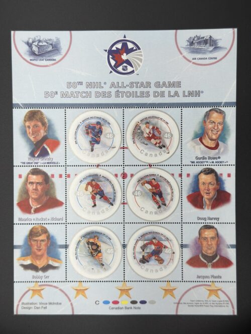 Cette feuille complète de timbres canadiens de 5 cents consacrés à l’art inuit, une émission de 1965, réalisée à une époque où Postes Canada amorçait une mise en valeur systématique des cultures autochtones constitue un témoin exceptionnel de l’histoire postale du pays. Préserver une feuille intacte de cette série, dont les exemplaires étaient massivement utilisés au quotidien, relève aujourd’hui de la rareté absolue, marges préservées, perforations régulières, alignement d’impression parfaitement lisible, tout concourt à restituer la matérialité d’un tirage tel qu’il sortait des presses il y a plus d’un demi‑siècle. Le motif stylisé, feuille d’érable, motifs géométriques et silhouette de canot traduit la rencontre entre iconographie nationale et expression artistique inuit, dans une esthétique typique du début des années 1960, où la modernité graphique s’alliait à une volonté de reconnaissance culturelle. En tant que feuille complète, l’ensemble dépasse la simple valeur philatélique, il devient un artefact culturel intégral, un fragment de mémoire imprimée révélant la sensibilité artistique, les techniques d’impression et l’identité visuelle du Canada de cette époque.